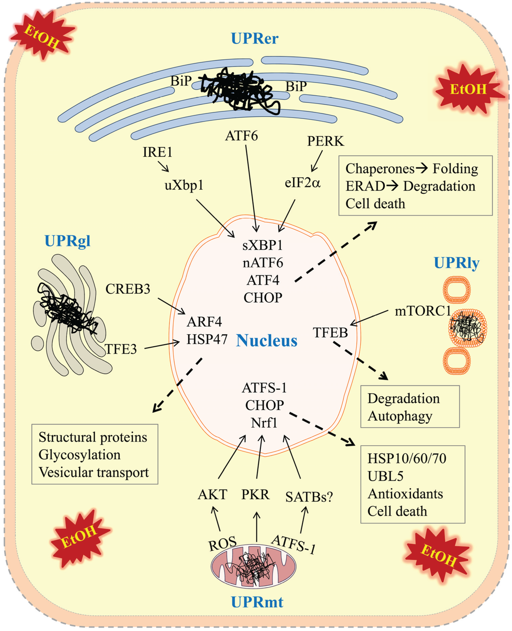 ) in the four types of cellular organelles, which create a stress condition in each of the organelles. The stress activates specialized transcriptional programs (solid arrows) mediated by distinct transducer(s) in each organelle leading to either restoration of organellar protein homeostasis or contribution to cell death (dashed arrows). EtOH, alcohol and/or alcohol metabolites; UPRer or UPR, unfolded protein response in the endoplasmic reticulum (ER); BiP/GRP78, binding immunoglobulin protein also known as 78 kDa glucose-regulated protein; IRE1α, inositol requiring enzyme 1α; ATF 4 or 6, activating transcription factor 4 or 6; nATF6, nuclear ATF6; PERK, PKR-like ER-localized eIF2α kinase; eIF2α, eukaryotic translation initiation factor 2α; uXBP1, un-spliced X-box binding protein 1; sXBP1, spliced XBP1; ERAD, ER associated degradation; CHOP, C/EBP homology protein 10. UPRgl, unfolded protein response in the Golgi apparatus; CREB3; a basic leucine zipper-containing transcription factor; TFE3, a basic-helix-loop-helix type transcription factor; ARF4, a member of the small GTPase family that regulates Golgi-to-ER vesicular transport; HSP47, a 47 kDa collagen-binding glycoprotein. UPRmt, unfolded protein response in the mitochondria; ROS, reactive oxygen species; ATFS-1, activating transcription factor associated with stress-1; AKT, also known as protein kinase B (PKB), is a serine/threonine-specific protein kinase; PKR, protein kinase RNA-activated also known as protein kinase R; Nrf1, the nuclear factor erythroid 2-related factor 1; SATBs, special AT-rich sequence-binding proteins; UBL5, ubiquitin-like 5; HSP10, 60 or 70, heat shock protein 10, 60 or 70 acting as mitochondrial chaperones. UPRly, unfolded protein response in the lysosomes; mTORC1, mammalian target of rapamycin complex 1; TFEB, transcription factor EB.