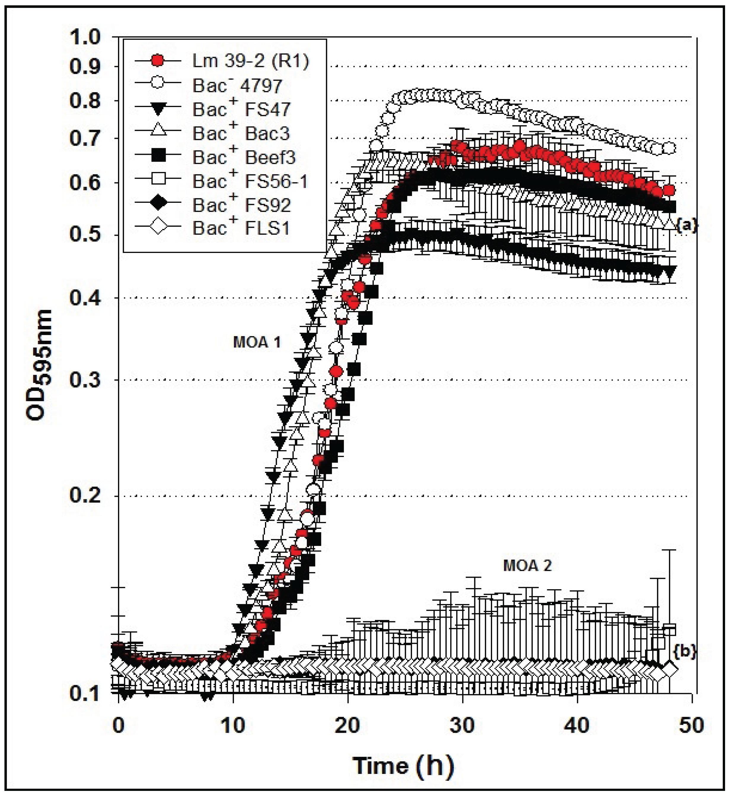 Figure 6). Although the reason was not ascertained, it is likely due to a slow lysis of the bacterial cells as bacteriocins form membrane pores in susceptible cells and/or the result of a change in cellular morphology upon nutrient depletion during extended stationary phase which may have an effect on optical density.