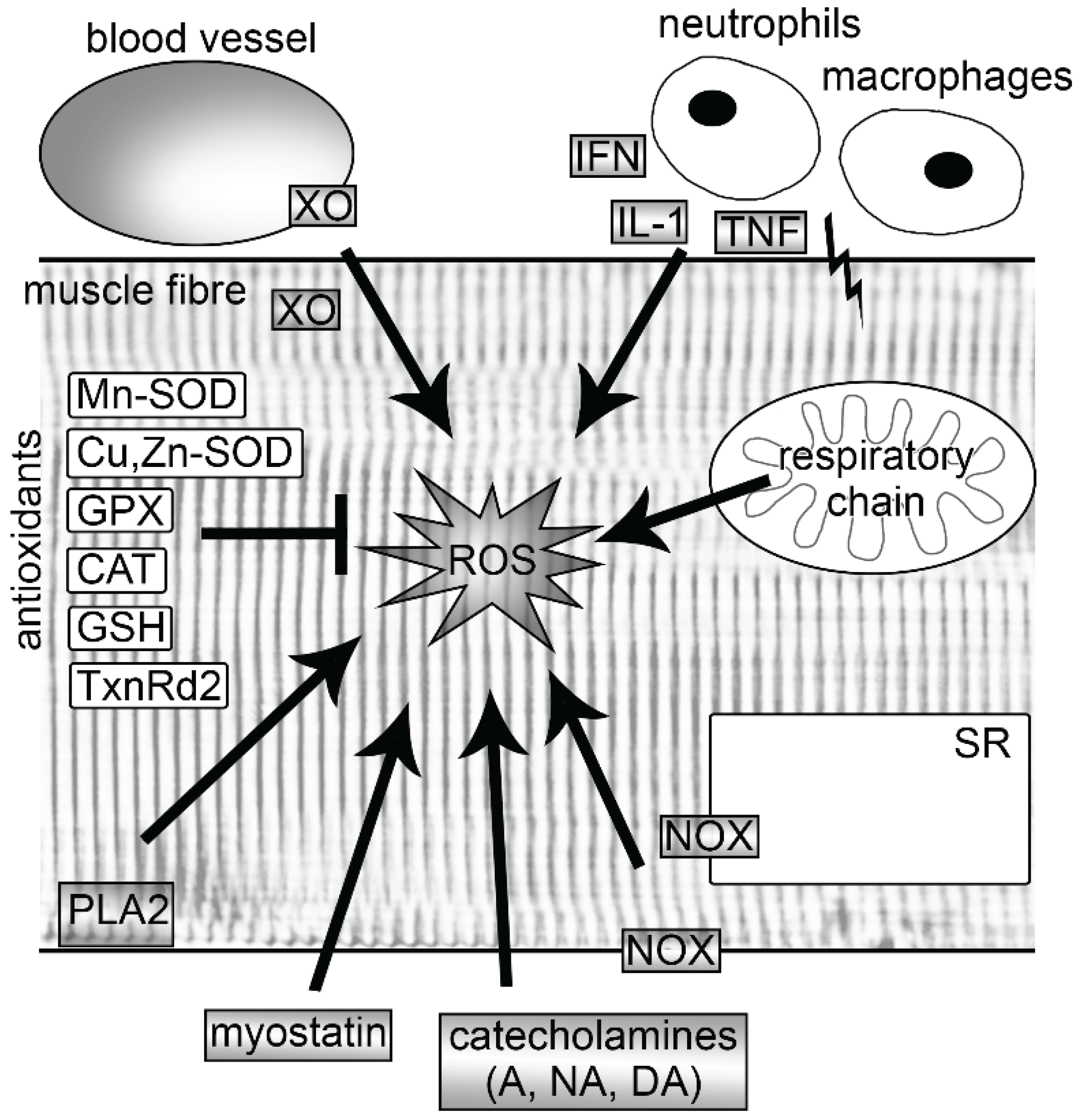 It has consistently been shown that muscle activity leads to a strong increase in ROS production [8]. However, there is a large debate about the sources and the extent of ROS that these sources produce. Several potential producers of ROS have been identified in muscle cells which are likely to be activated by different stimuli. Among these are mitochondria, nicotinamide adenine dinucleotide phosphate (NADPH) oxidases (NOXs), phospholipase A2 (PLA2), xanthine oxidase (XO) and lipoxygenases (Figure 1). Some of these are discussed in more detail below. In addition to these intracellular sources, ROS has been shown to be produced from non-muscle sources. Strenuous exercise can elicit muscle injuries, which then lead to the activation of the neutrophils and macrophages via interferon-γ (IFN-γ), interleukin-1 (IL-1) and tumor necrosis factor (TNF) (for more detailed information see reviews [9,10]). These immune cells excessively produce ROS (oxidative burst), which is a central component of neutrophil defense mechanism. In addition, the exercise-induced increase of catecholamines (adrenaline, noradrenaline, dopamine) also play a role in the generation of ROS [11], as well as ROS derived from endothelium [12] (Figure 1).