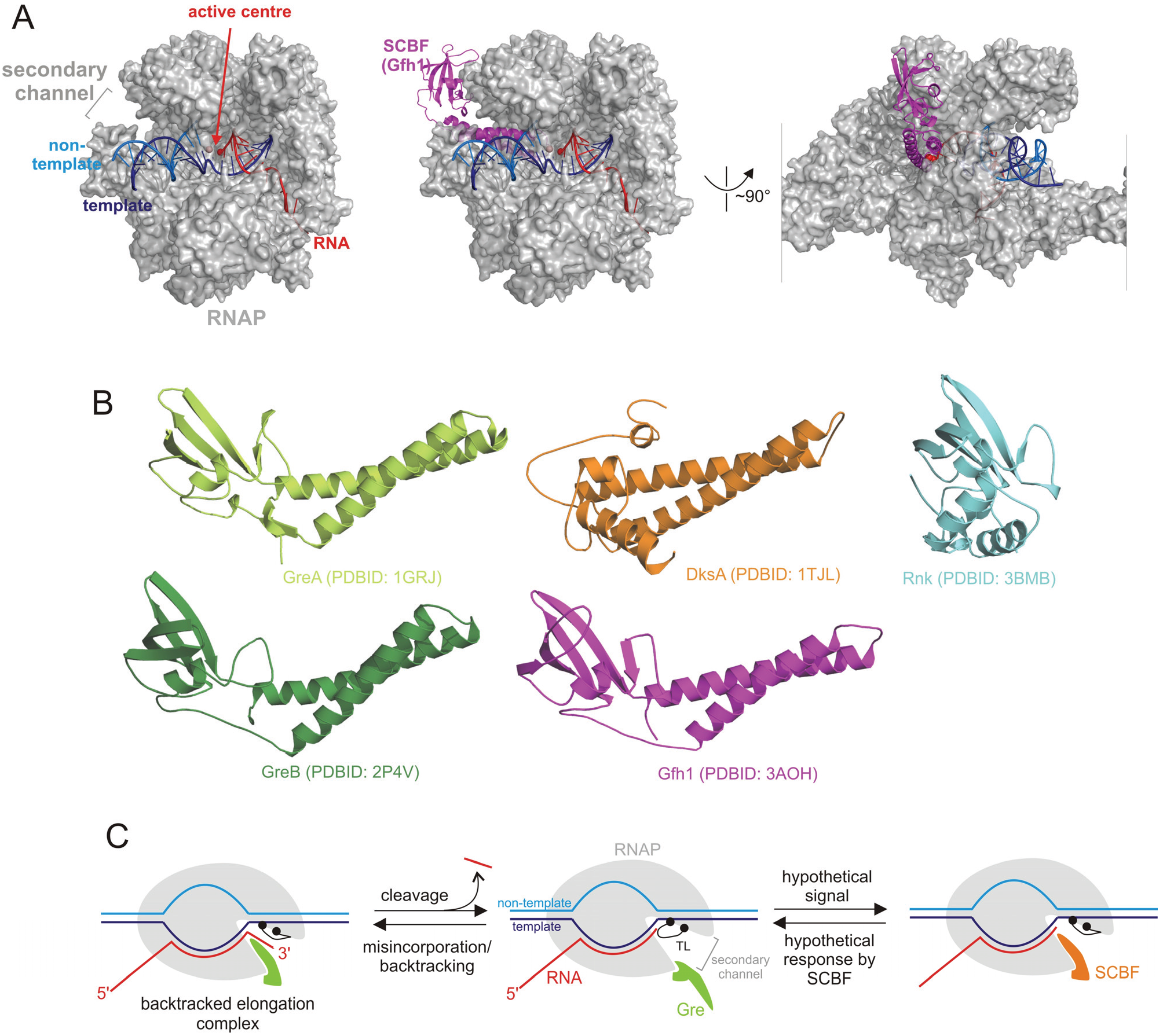 Bacterial SCBFs share a similar structural fold (Figure 1B). They are small proteins with a globular C-terminal domain, responsible for binding to RNAP, and a coiled-coil domain, which, at least for some of SCBFs, has been shown to be inserted through the secondary channel to modulate transcription. Two functionally important acidic residues are typically located at the tip of this domain.