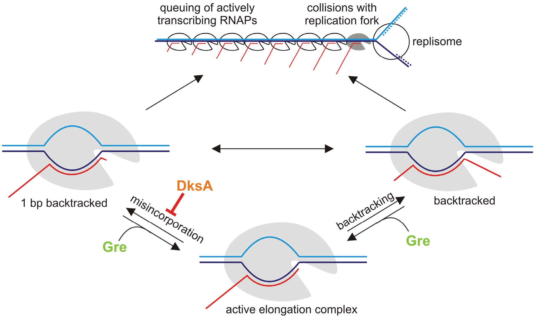 Similar roles for Gre and DksA during transcription elongation. Backtracking caused by misincorporation leads to a pause in transcription as with sequence-dependent backtracking, and may lead to the formation of RNAP traffic jams and collisions with replication forks. Gre factors resolve backtracked complexes formed by either mechanism. While DksA cannot prevent or resolve sequence-dependent backtracking, it increases accuracy of RNA synthesis and, thus, reduces the chance of misincorporation and, consequently, reduces formation of one base pair backtracked pause.
