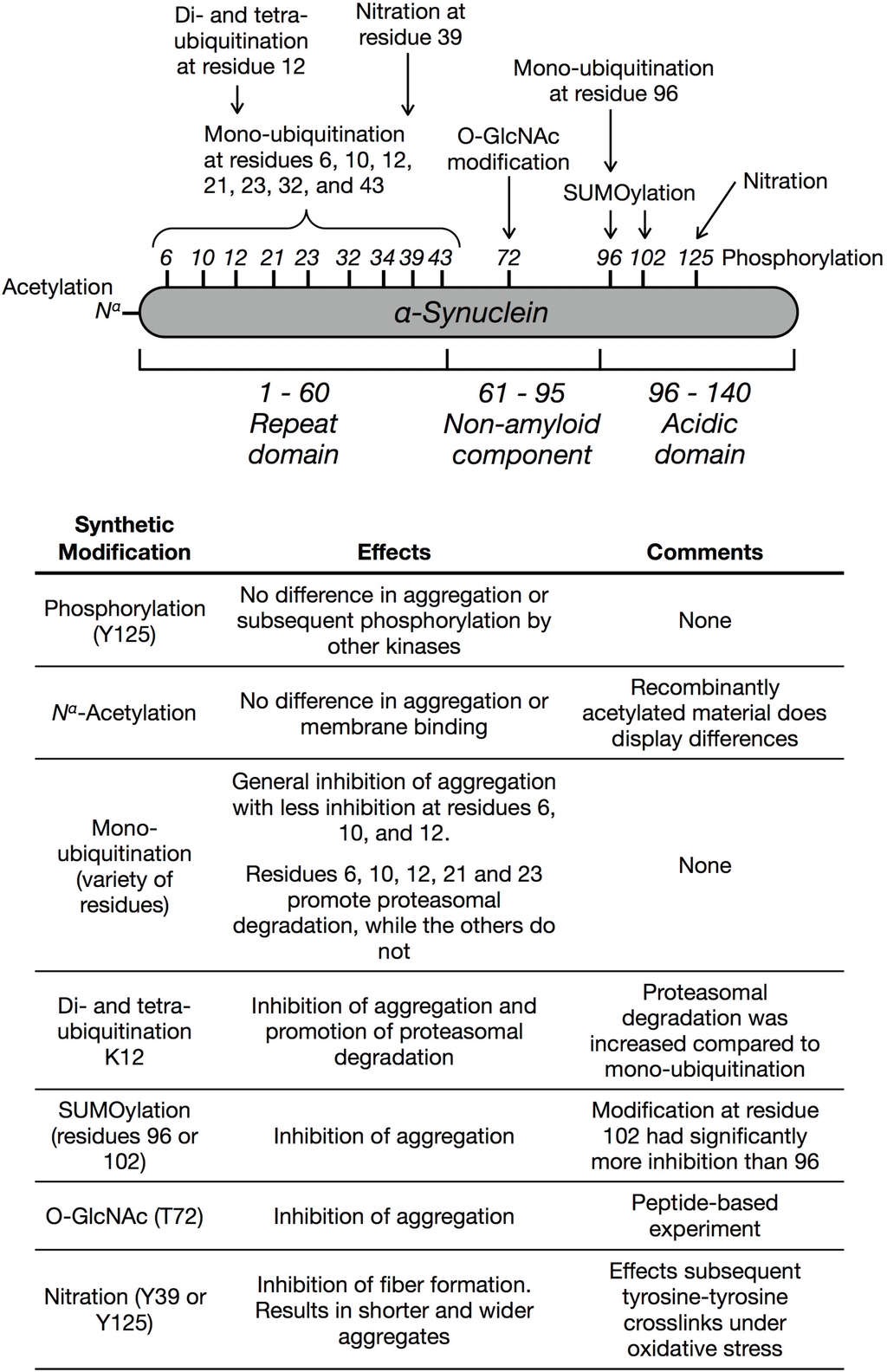 Schematic representation of the protein α-synuclein, consisting of an N-terminal repeat domain, the non-amyloid beta component domain that is required for aggregation, and a C-terminal acidic domain. The sites and identities of posttranslational modifications that have been studied using synthetic proteins or peptides are highlighted and the general effects are tabulated.