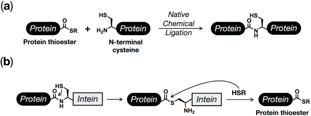 Chemical synthesis has long played a key role in the discovery of biological processes through the production of homogeneous, structurally-defined materials. A major step towards extending the power of chemical synthesis to proteins came from the development of native chemical ligation (NCL, Figure 2a) []. Using this method, two unprotected peptides can be reacted with each other under neutral aqueous conditions, resulting in the formation of a native peptide bond. The first step of NCL involves the reversible reaction between a C-terminal thioester on one peptide and an N-terminal cysteine residue on a second peptide. Once formed this inter-peptide thioester bond collapses by a spontaneous S to N acyl shift, resulting in an amide bond. Because the first step of this process is reversible, NCL is compatible with the side-chain functionalities of all the naturally occurring amino acids including cysteine. Additionally, proteins can be prepared semi-synthetically using NCL by reacting synthetic peptide-thioesters with recombinantly expressed proteins containing N-terminal cysteines. While large proteins have been generated using only NCL, the technique is inherently constrained in the preparation of peptide-thioesters by the limitations of solid-phase peptide synthesis (SPPS).