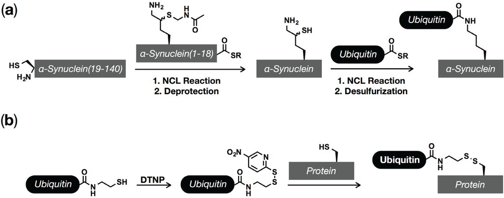 Chemical methods for the installation of ubiquitin and ubiquitin-like modifications. (a) Synthesis with δ-mercaptolysine. A synthetic peptide thioester containing a protected δ-mercaptolysine is reacted with a recombinant protein fragment to generate full-length α-synuclein. After deprotection of the δ-mercaptolysine residue, it can be selectively reacted with a recombinant ubiquitin thioester. Desulferization then gives site-specifically ubiquitination α-synuclein with no mutations. (b) Disulfide-directed ubiquitination. A C-terminal ubiquitin thiol, produced using intein chemistry, can be activated as a mixed disulfide, which can then be transferred to a cysteine residue on α-synuclein.