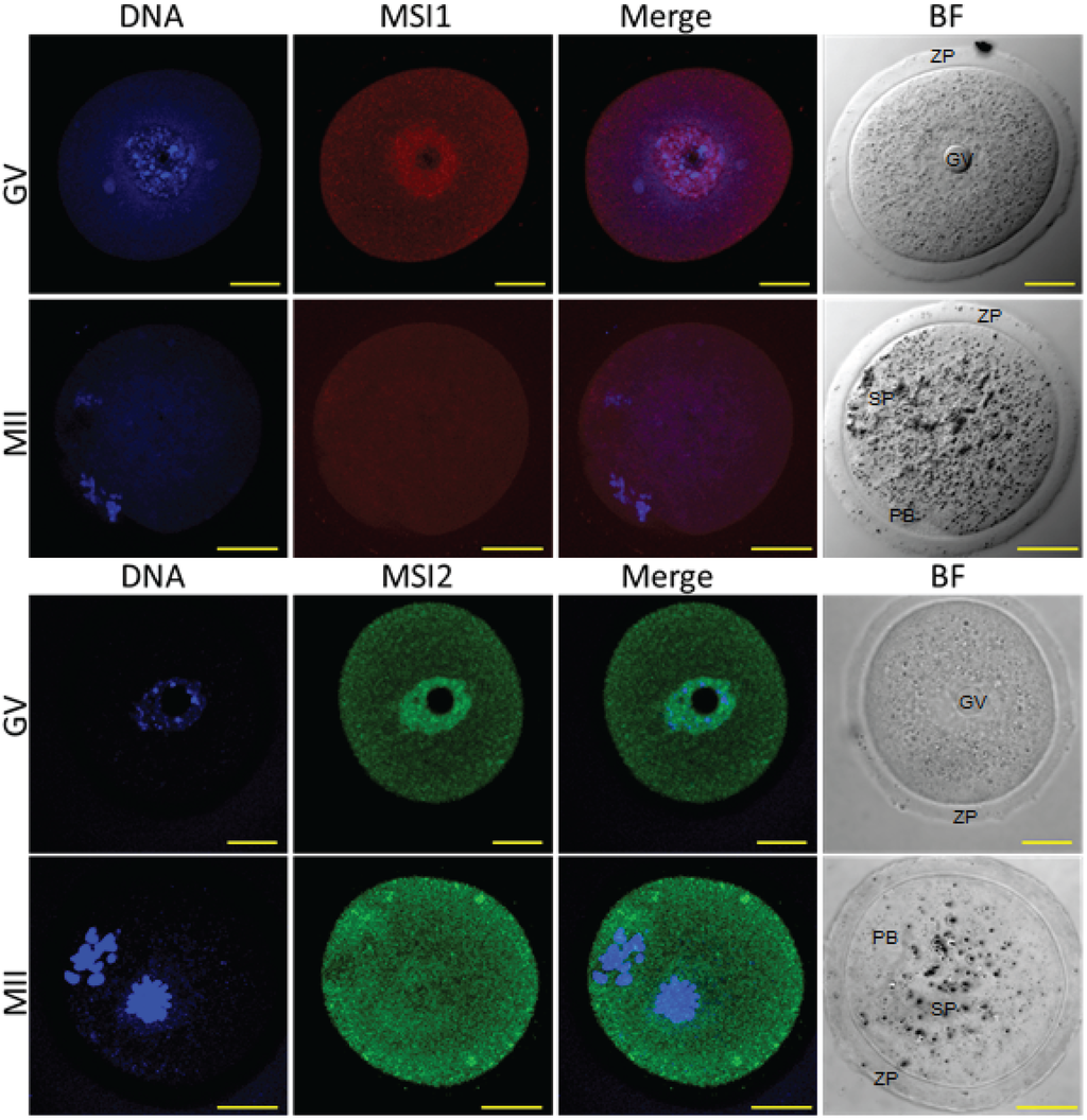 Immunocytochemistry of Musashi in germinal vesicle (GV) and metaphase II (MII) oocytes. Mouse oocytes were probed for antibodies against MSI1 (red) and MSI2 (green), and counter-stained with DNA marker Hoechst (blue). Representative images show Z-stack of total oocyte. Bright-field (BF) images were taken alongside confocal immunofluorescent microscopy. In BF images GV = germinal vesicle, ZP = zona pellucida, PB = polar body, SP = MII spindle. Scale bar = 20 μm. Consistent for n = 10.