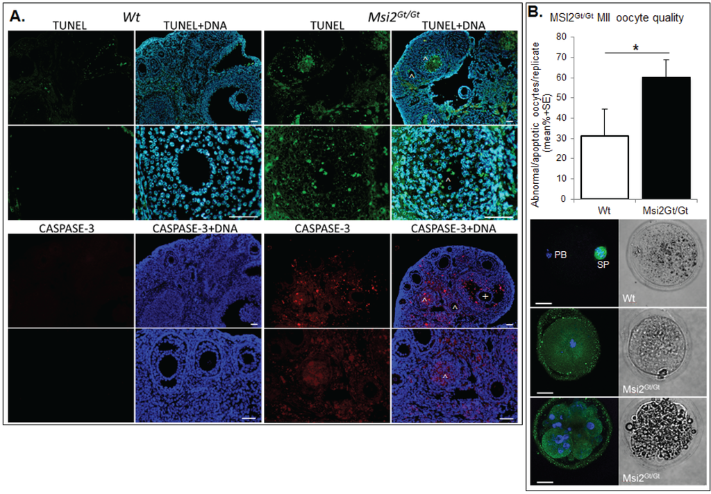Assessment of Msi2Gt/Gt ovarian and oocyte health. (A) Immunofluorescence of TUNEL and CASPASE-3 in Msi2Gt/Gt and Wt adult ovary. Representative images demonstrate an increase in TUNEL (green) and CASPASE-3 (red) in Msi2Gt/Gt pre-antral (^) and antral (+) follicles, verified via quantitative analysis n = 4. Scale bar = 50 μm; (B) Msi2Gt/Gt and Wt MII oocyte quality. MII oocytes collected from the oviductal ampullae of super-ovulated adult mice were fixed and subjected to immunocytochemistry for α-tubulin (green) to identify spindles and Hoechst (blue) to identify polar body DNA and oocyte chromosomes. Representative images show typical MII staining pattern in Wt depicting polar body (PB) formation and normal chromosome and spindle alignment (SP). Msi2Gt/Gt images depict irregular spindle assembly and chromosome alignment and oocyte apoptosis. n = 3 biological replicates, 3 mice/replicate, *: denotes p < 0.05. Scale bar = 20 μm.