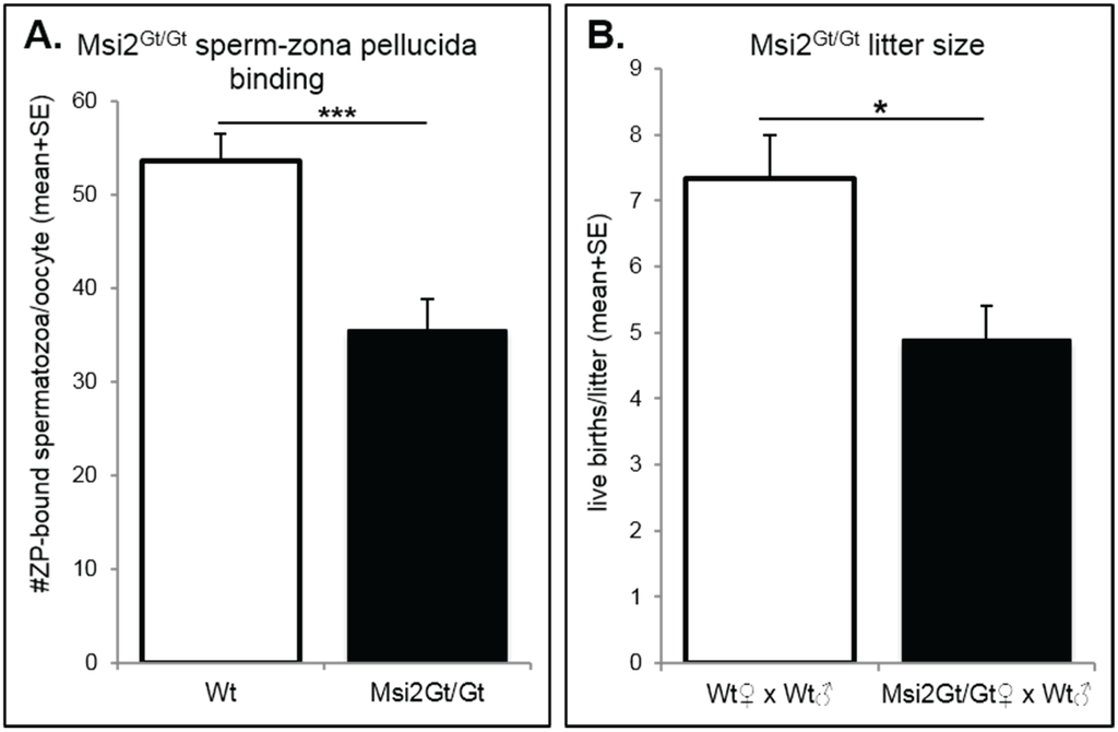 Assessment of Msi2Gt/Gt fertility. (A) Sperm-zona pellucida binding in Msi2Gt/Gt (n = 8) and Wt (n = 9) MII oocytes. MII oocytes were collected from the oviductal ampullae of super-ovulated adult mice and subjected to sperm zona-binding with capacitated mature epididymal spermatozoa from control adult males. Following incubation and washing, the number of sperm that remained bound to the zona pellucida was counted. ***: denotes p < 0.001. (B) Average litter size in Msi2Gt/Gt and Wt females. Breeding pairs were assembled, following genotyping, at ~5 weeks and pairs were kept together for up to 6 months. The average number of live births per litter was recorded. n = 3 individual Wt × Wt breeding pairs, n = 10 individual Msi2Gt/Gt (female) and Wt (male) pairs. * denotes p < 0.05.