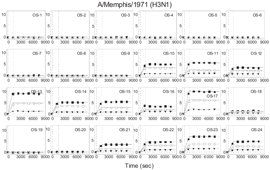 Figure 1 displays association-dissociation curves of A/Mem71 (H3N1) to surface-bound synthetic glycans. The ellipsometry sensor signal, displayed in arbitrary unit, is proportional to the surface mass density of the capture viruses. A signal of 20 corresponds to a fully covered monolayer of influenza A viruses. The virus binds to both α2-3-linked (OS-10 through OS-17) and α2-6-linked (OS-18 and OS-21 through OS-24) sialosides. It does not bind to glycans either lacking terminal sialic acids (OS-1 through OS-9) or having terminal but modified sialosides (OS-19 and OS-20). Dissociation of captured viruses is negligible over as long as 8 h. Such a remarkable stability of the virus-glycan complexes is due to the avidity effect—a single virus binding with multiple sialyl glycan receptors on the solid surface [42]. Avidity plays an important role in both virus infection and virus antigenic drift [43,44]. We use avidity constants extracted from the binding curves to characterize the receptor specificity of the virus. Such a receptor specificity profile can be compared with hemagglutinin assays as the latter are also avidity-based.