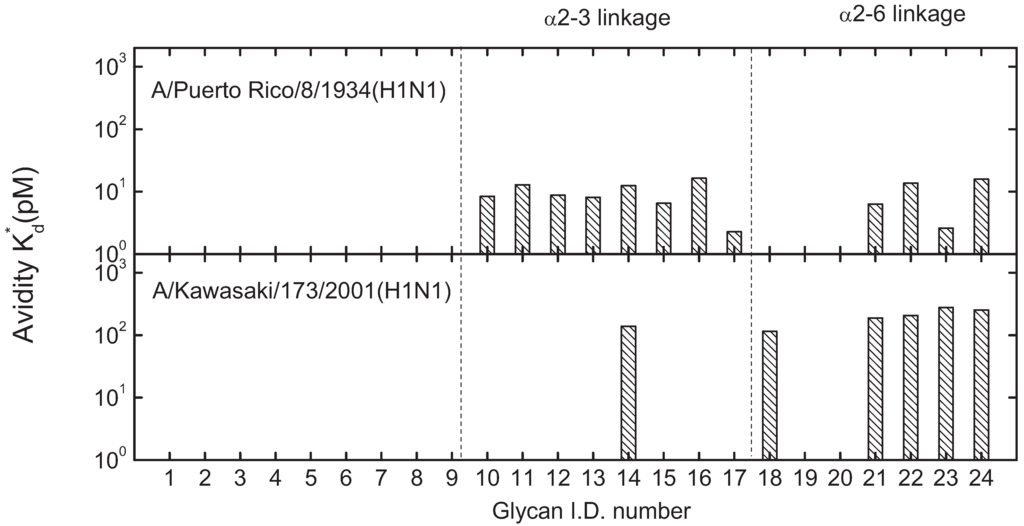 Figure 3 shows the avidity binding profiles of two H1 virus strains. A/PR8 binds to both α2-3- and α2-6-linked sialyl glycans [15,49,50]. In contrast MDCK-grown A/K173 strain binds to all five α2-6-linked sialosides and to only one of eight α2-3-linked sialosides, exhibiting a clear preference for α2-6-linked sialic acids. The preference of binding to α2-6-linked sialosides by A/K173 has been observed previously [8,51]. The apparent equilibrium dissociation constants for A/PR8 are one order of magnitude smaller than those for A/K173 and the three H3 strains indicating that A/PR8 has a stronger avidity to the glycan receptors. This also means that one HAU of A/PR8 has a smaller number of viral particles than there are in one HAU of the other four strains, and therefore the actual Kd* for A/PR8 is even smaller.