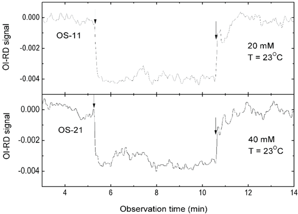 Association-dissociation curves of solution-phase α2-3-linked sialyllactose (OS-11 without the biotin linker, 20 mM) and α2-6-linked sialyllactose (OS-21 without the biotin linker, 40 mM) to immobilized A/Mem71 on the solid surface, acquired at 23 °C (T = 296 K).