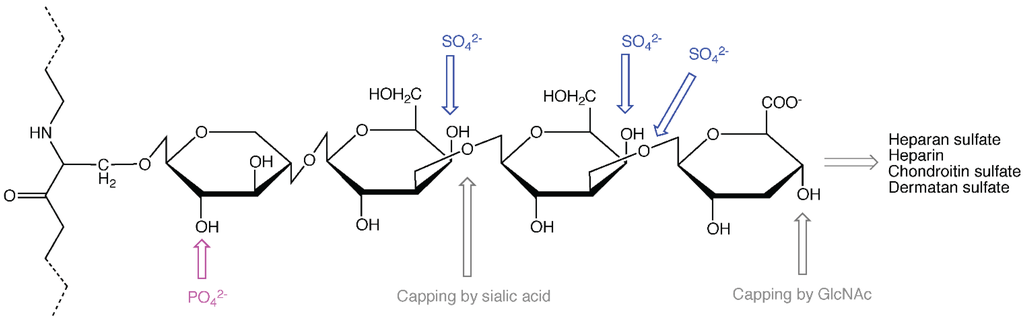 PG protein cores are not just scaffolds for GAG extension. More than 40 different protein cores have been identified, many of which have been grouped according to their protein domains [8]. Such domains may be engaged in a number of different interactions and many of the protein cores display variants resulting from alternative splicing. Several reports show that PG protein cores may influence the type and modification patterns of the subsequently attached GAG chains, but how the information is transmitted from the protein core to the enzymes engaged in polymerization and modification of GAGs is not clear. One suggested mechanism is through sulfation and phosphorylation of sugar units of a linker tetrasaccharide that attaches GAG chains to a modification site of a protein core. The picture is complicated by the fact that the same protein core can acquire different types of GAG chains in different cell types, showing that GAG modification for a particular protein core may be cell type and tissue specific. For instance, the PG Serglycin is modified by CS chains, often sparsely sulfated in most cell types where it is expressed, but obtains highly sulfated heparin chains in mast cells [9].