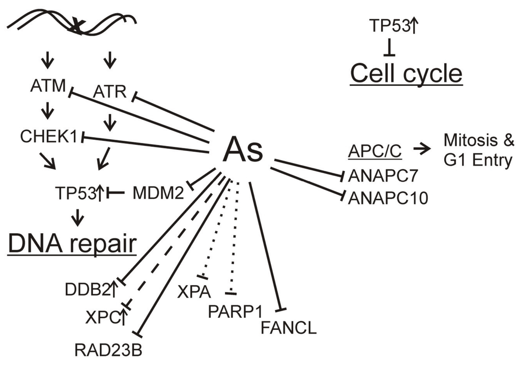 Figure 1. Arsenic inhibition of DNA damage response. DNA damage normally leads to activation of signaling kinases converging through TP53 stimulating DNA repair gene expression and inhibition of cell cycle. Arsenite inhibits transcription (solid lines) of signaling kinase genes (ATM, ATR, CHEK1), MDM2, and downstream DNA repair genes DDB2 and RAD23B. Expression of XPC also is inhibited by arsenite (dashed line), as is function of XPA and PARP1 by displacing zinc from the zinc fingers in these proteins (dotted lines). These effects likely contribute to decreased nucleotide excision repair. FANCL transcription inhibition may lead to decreased interstrand crosslink repair. Arsenite also inhibits transcription of ANAPC7 and ANAPC10, components of the anaphase promoting complex/cyclosome (APC/C) consistent with arsenite disruption of mitotic progression.