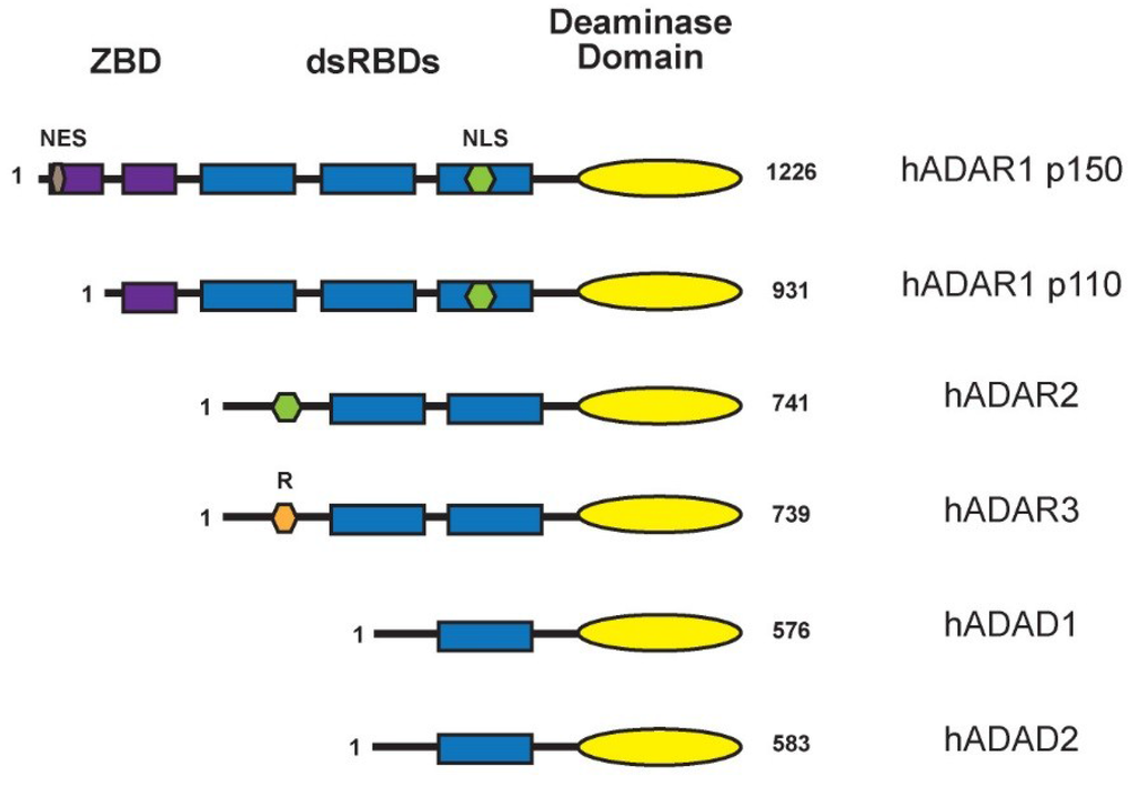 Domain organization of ADAR and ADAD proteins expressed in Homo sapiens. All of the proteins contain N-terminal dsRBDs and C-terminal deaminase domains. An arginine rich (R) region is present at the N-terminus of ADAR3. There are two isoforms of hADAR1, ADAR1 p110 and ADAR1p150, both of which contain a Z-DNA binding domains (ZBD) at the N-terminal.