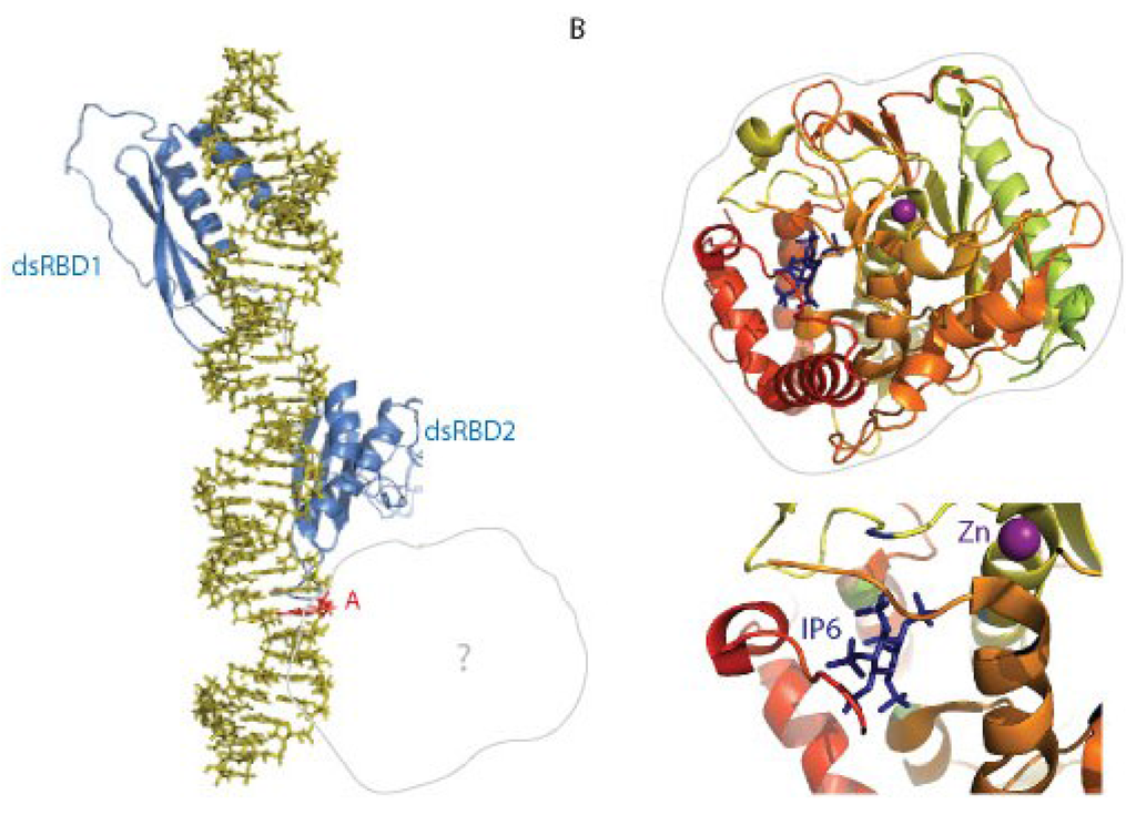 Structural information of ADAR enzymes. (A) NMR structure of the dsRBD1 and dsRBD2 of hADAR2 (blue) in complex with the RG stem loop RNA target [37]. The specific adenosine that is deaminated in the catalytic reaction is highlighted in red. In grey is shown where the deaminase domain is likely positioning during the reaction. PDB file: 2L3J. (B) Crystal structure of the catalytic domain of hADAR2 [41], secondary structures are colored from yellow (N-terminus) to red (C-terminus). The Zinc ion and inositol hexakisphosphate molecule (IP6) cofactor are highlighted and colored in blue. PDB file: 1ZY7.