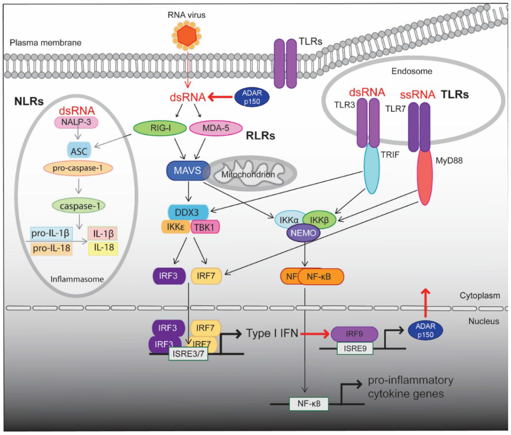 Intracellular detection of viral RNA by PRRs and activation of the innate immune response. The three classes of PRRs responsible for detection of viral RNA are the TLRs, the RLRs, and the NLRs. In the endosome viral ssRNA is detected by TLR7 whereas viral dsRNA is recognized by TLR3. TLR7 recruits the signaling adaptor MyD88 whereas TLR3 associates TRIF. MyD88 elicits the production of type I IFNs through the direct activation of IRF7. TRIF activates the TRAF family member-associated TANK and IKKε both of which undergo phosphorylation to activate both IRF3 and IRF7. Both IRF3 and IRF7 form homodimers which translocate to the nucleus leading to the induction of type I IFN. At the same time, both TRIF and MyD88 activate IKK. The IKK complex triggers the release and translocation of NF-κB to the nucleus leading to the production of pro-inflammatory cytokines. In the cytoplasm, short dsRNA with 5'triphospahte ends is detected by RIG-I and long dsRNA is sensed by MDA5. Activation of RIG-I and MDA5 results in the recruitment of MAVS via CARD domain interactions. MAVS dependent signaling causes the translocation of the transcription factors IRF3 and NF-κB for the induction of type I IFN and pro-inflammatory cytokines respectively. The inflammasome is activated by dsRNA via NALP3-dependent signaling pathway. NALP3 together with ASC recruit pro-caspase-1 which in turn undergoes auto-cleavage to produce caspase-1. Activation of caspase-1 is required for the cleavage of pro-IL-1β and pro-IL-18, and subsequent secretion of the proinflammatory cytokines IL-1β and IL-18, respectively. ADAR1p150 edits dsRNA within the cytoplasm and is induced by IFN.