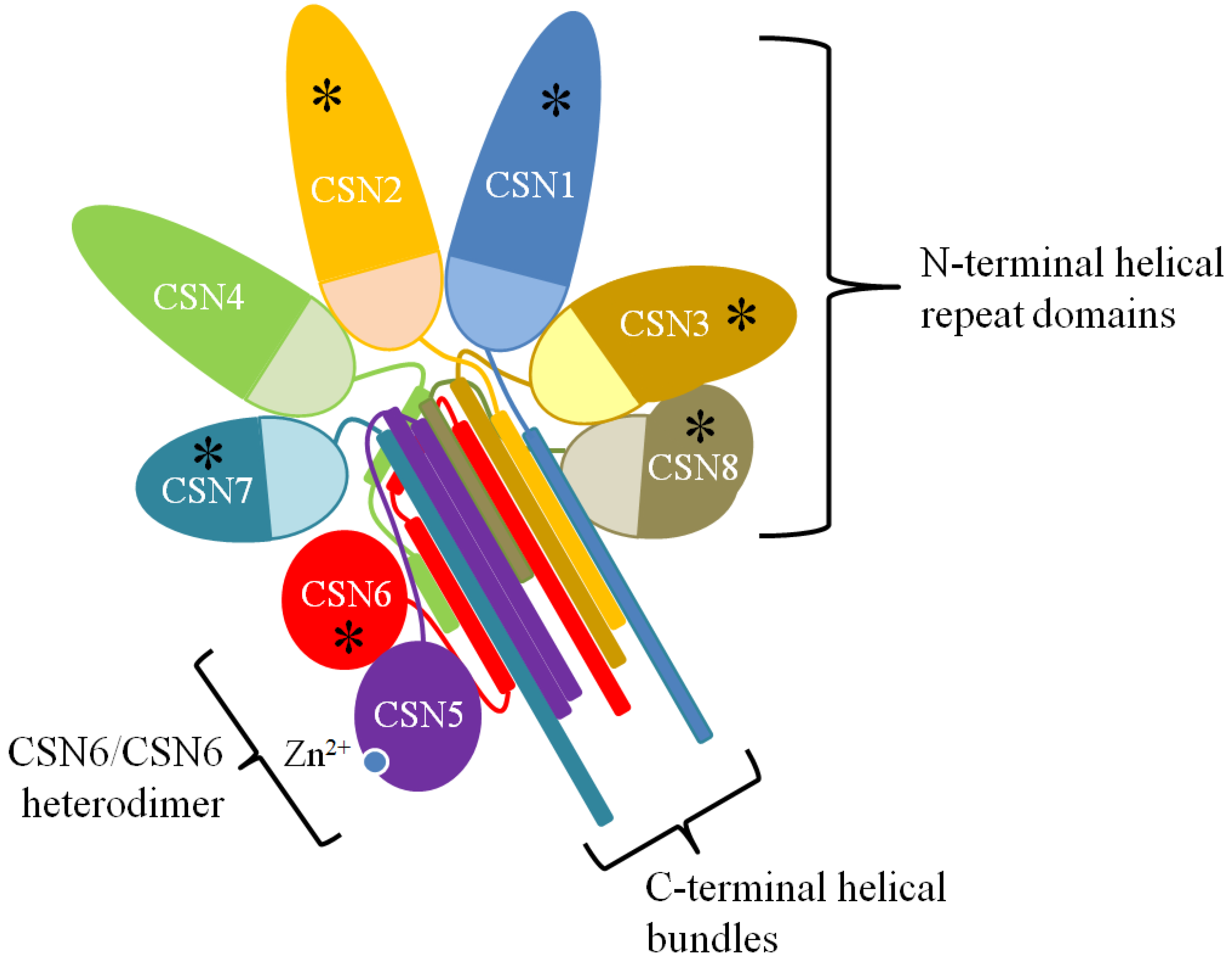The CSN Structure. A two-dimensional schematic representation of the three-dimensional structure of the CSN as determined by Lingaraju et al [34]. The N-terminal repeat domains radiate out from the winged-helix domains of the PCI ring (lightly shaded half-circles). The C-terminal helical regions form a helical bundle that stabilizes the complex. The MPN domains of CSN5 and CSN6 rest on the helical bundle. Subunits reported as phosphorylation targets are marked with an asterisk (*).