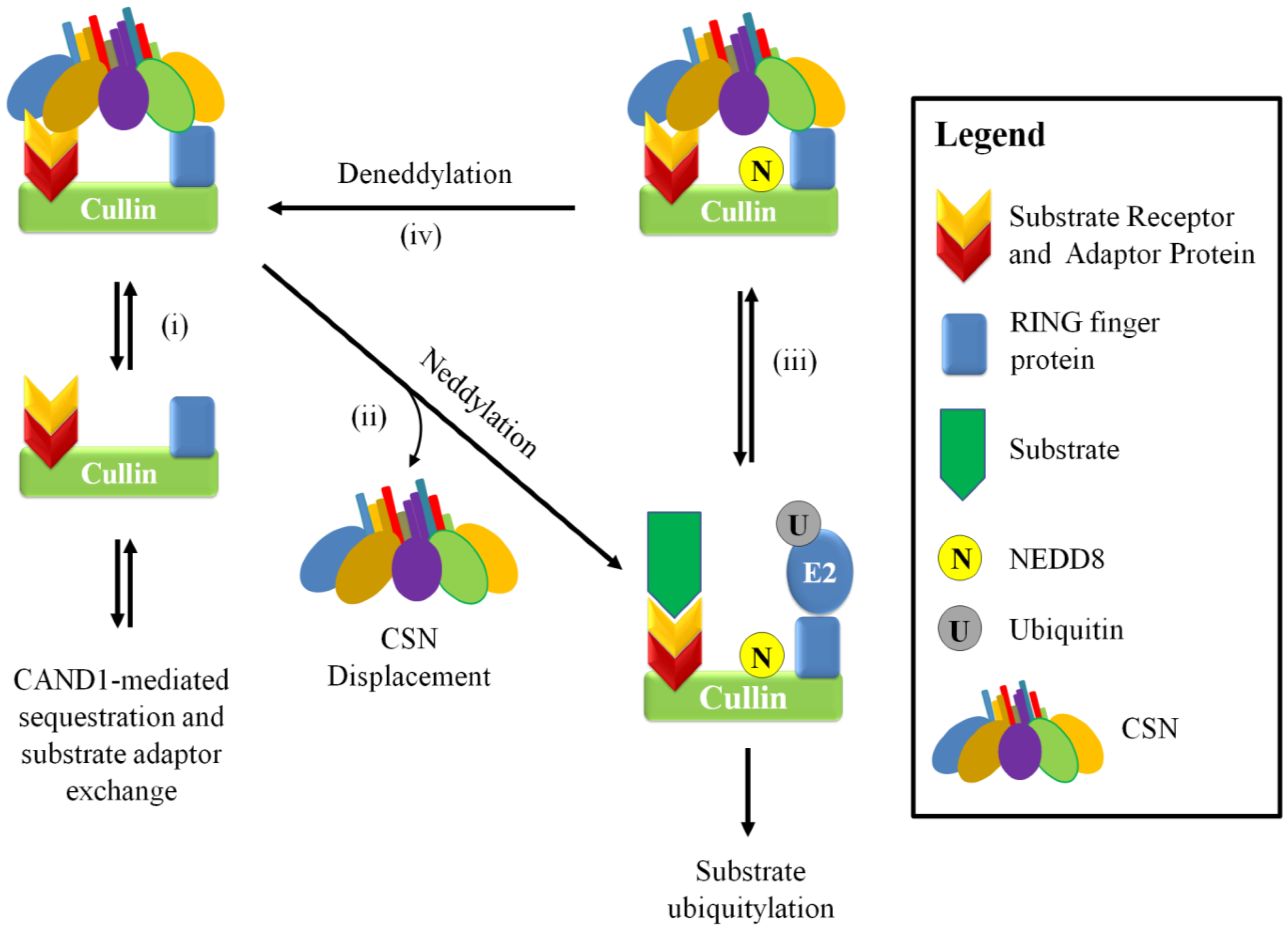 The deneddylation of CRLs is achieved by the CSN, through its catalytic subunit CSN5. Initial understanding was that the CSN holoenzyme is transiently associated with the CRL to deneddylate cullins; however, a more complex picture of its role has begun to emerge. Structural analysis of the CSN-CRL association suggests that in vitro interaction with various cullins can further promote CSN5 activation [34,89]. The deneddylated cullin is a substrate for the protein CAND1 (cullin-associated NEDD8-dissociated protein 1), which regulates CRL activity by sequestering deneddylated cullins [90,91] (Figure 3). However, this interaction can be reversed depending on the levels of substrate adaptor proteins. CAND1 regulation was shown to only affect deneddylated CRLs, since adding CAND1 to assembled CRLs containing neddylated cullin blocked substrate adaptor dissociation [92]. The current belief is that that CAND1 promotes exchanging of the substrate adaptors in response to changing conditions in the cell [92,93,94,95]. It should be noted that CAND1 does not associate to the same degree with different cullin classes and may also display a preference to the exchange of particular substrate adaptors [95].