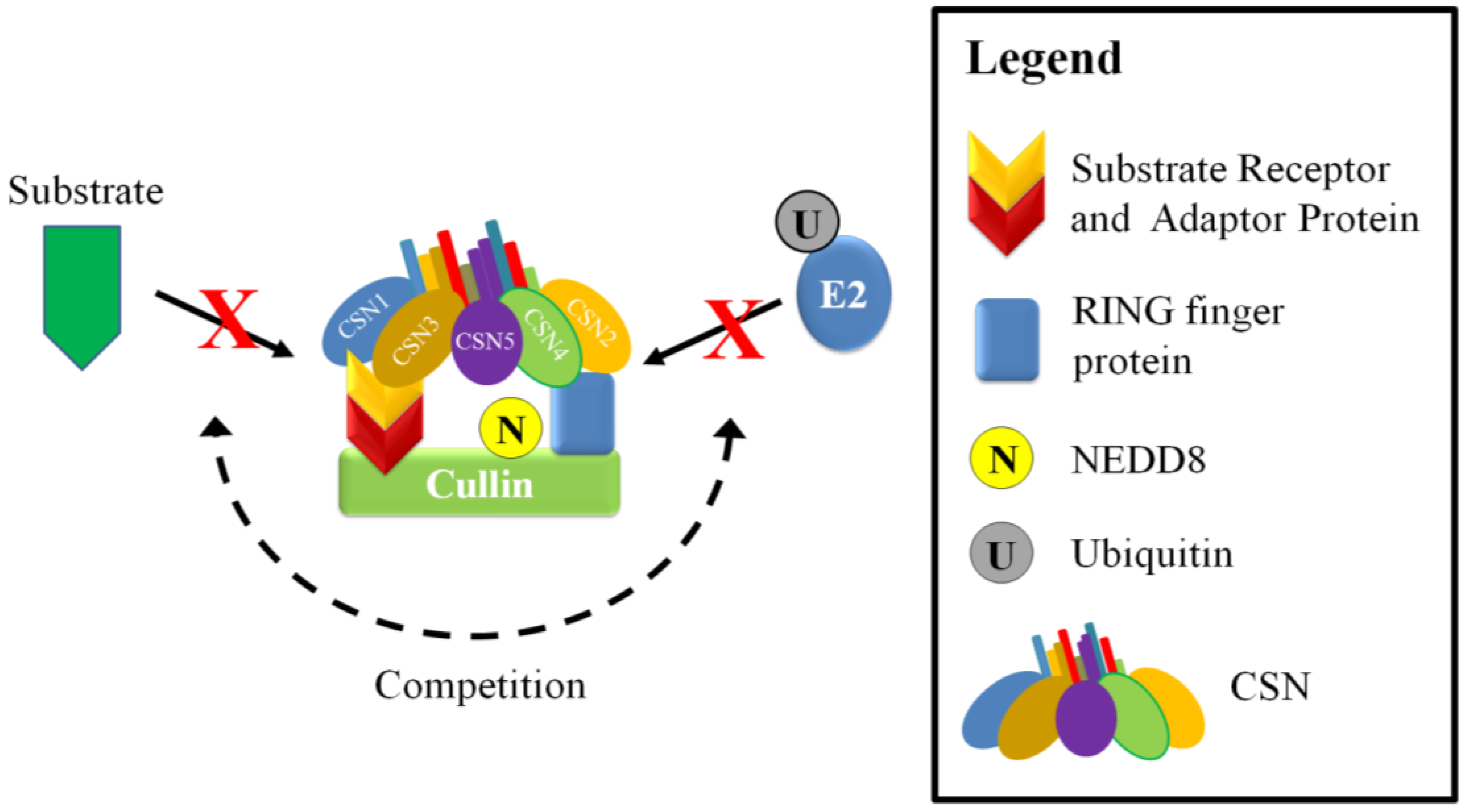 A schematic model of neddylation-independent regulation of CRLs by the CSN. The CSN interaction can inhibit CRLs in a neddylation independent manner by competing with substrates and ubiquitin-E2s for binding sites.
