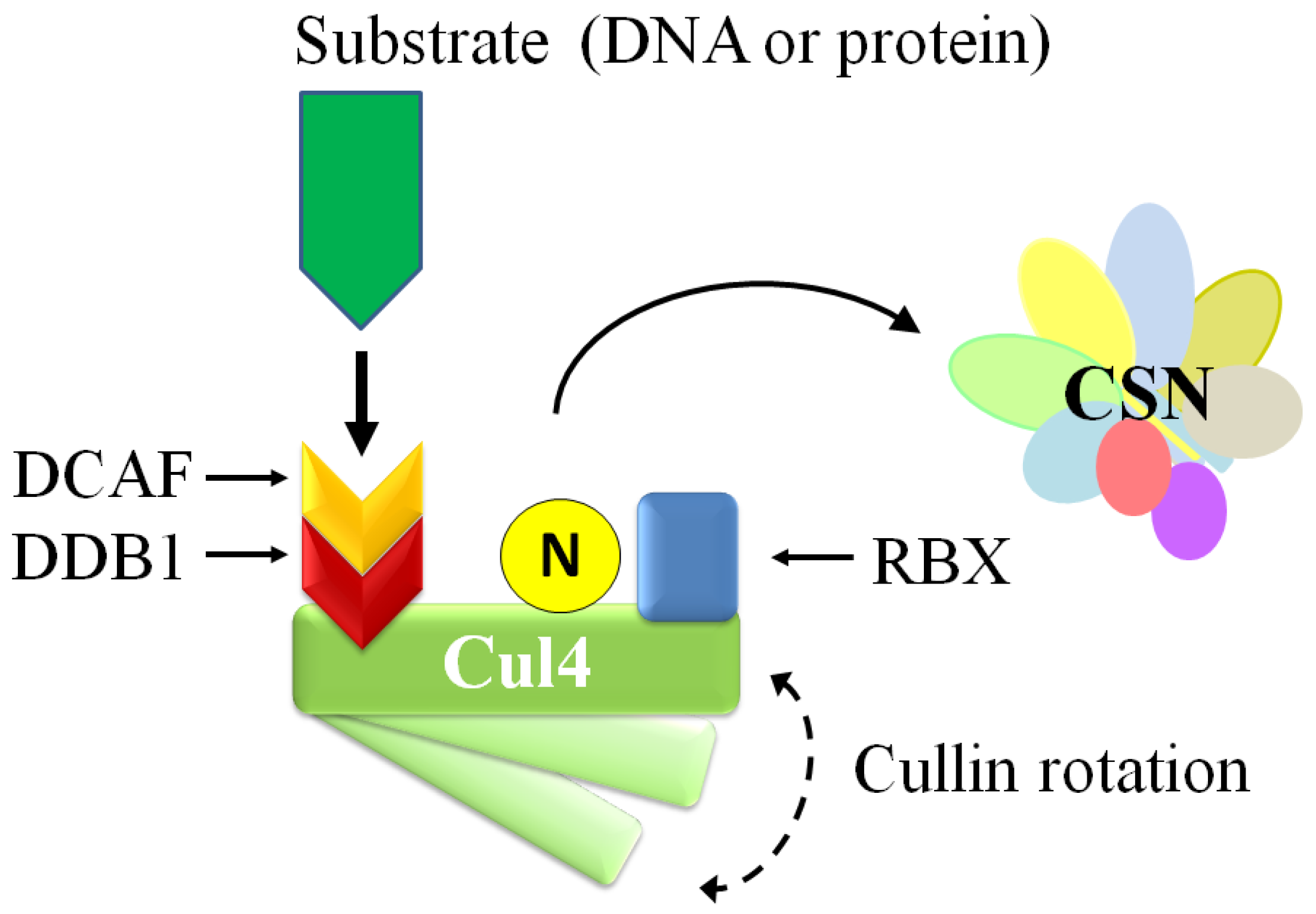 Discussion of the role of the CSN and neddylation in NER requires a brief introduction to CRL4. The CRL4 architecture is composed of the scaffold protein cullin 4, RBX1, DDB1, and a family of substrate-specific receptor proteins termed DCAFs (Ddb1- and Cul4-associated factors) (Figure 6) [96]. Cullin 4 exists as two related forms in humans and other higher eukaryotes. Because of their high sequence identity, and that their respective CRL architectures are nearly identical, cullin 4A and cullin 4B share functional redundancy with limited exceptions [96,129]. Cullin 4 is involved in different aspects of the DNA damage response. Because untranscribed DNA is packaged more tightly into chromatin, the repair proteins have to gain access to (UV-induced) DNA damage sites. One approach is to modify histone proteins, and another is to remodel chromatin. Of note is the role of DDB2, which forms a heterodimer with DDB1 (p127) in the DDB complex. DDB1/2 associates with CRL4s to bring cullin 4 to chromatin after UV-mediated DNA damage. DDB2 probes the DNA strand for damage, and when detected it exposes, and stabilizes the CPD and 6-4PP lesions. Structural and molecular analysis indicates that this is mediated by the β-hairpin and WD40 domains within DDB2 [96,123]. Compared to XPC, DDB2 has a higher affinity for CPDs and 6-4PPs. This DNA interaction leads to CSN displacement, CRL4DDB2 reconfiguration, neddylation, and ligase activation, which allows the ubiquitylation of XPC, histones, and possibly other proteins in a zone surrounding the lesion [123,124]. DDB2 itself is a target of CRL4 [130,131] and ubiquitylated DDB2 is thought to allow dissociation from the repair site. CRL4DDB2 ubiquitin ligases can also serve to ubiquitylate histones around the damage site in vitro to promote the recruitment of NER proteins such as XPA [132]; however, further studies are needed to fully understand its role [123]. In addition to affecting chromatin remodeling, XPC polyubiquitylation by CRL4 improves its stability and ability to bind to DNA, but so far the precise ubiquitylation site is unknown [124]. Instead, XPC eventually dissociates from the repair site to allow binding of downstream proteins. Recent investigations have revealed the possible role of an additional E3 ligase in this event. The SUMO-targeted ubiquitin ligase (STUbL) RNF111 ubiquitylates SUMOylated XPC at the residue K63 and is thought to promote dissociation from the damage site and association of downstream proteins XPG and ERCC1 [133,134,135]. In addition, polyubquitylated XPC is not immediately degraded by the 26S proteasome because its association with RAD23, a protein with ubiquitin-associated (UBA) domains, inhibits its degradation until XPC has bound to damaged DNA [136,137,138,139,140].