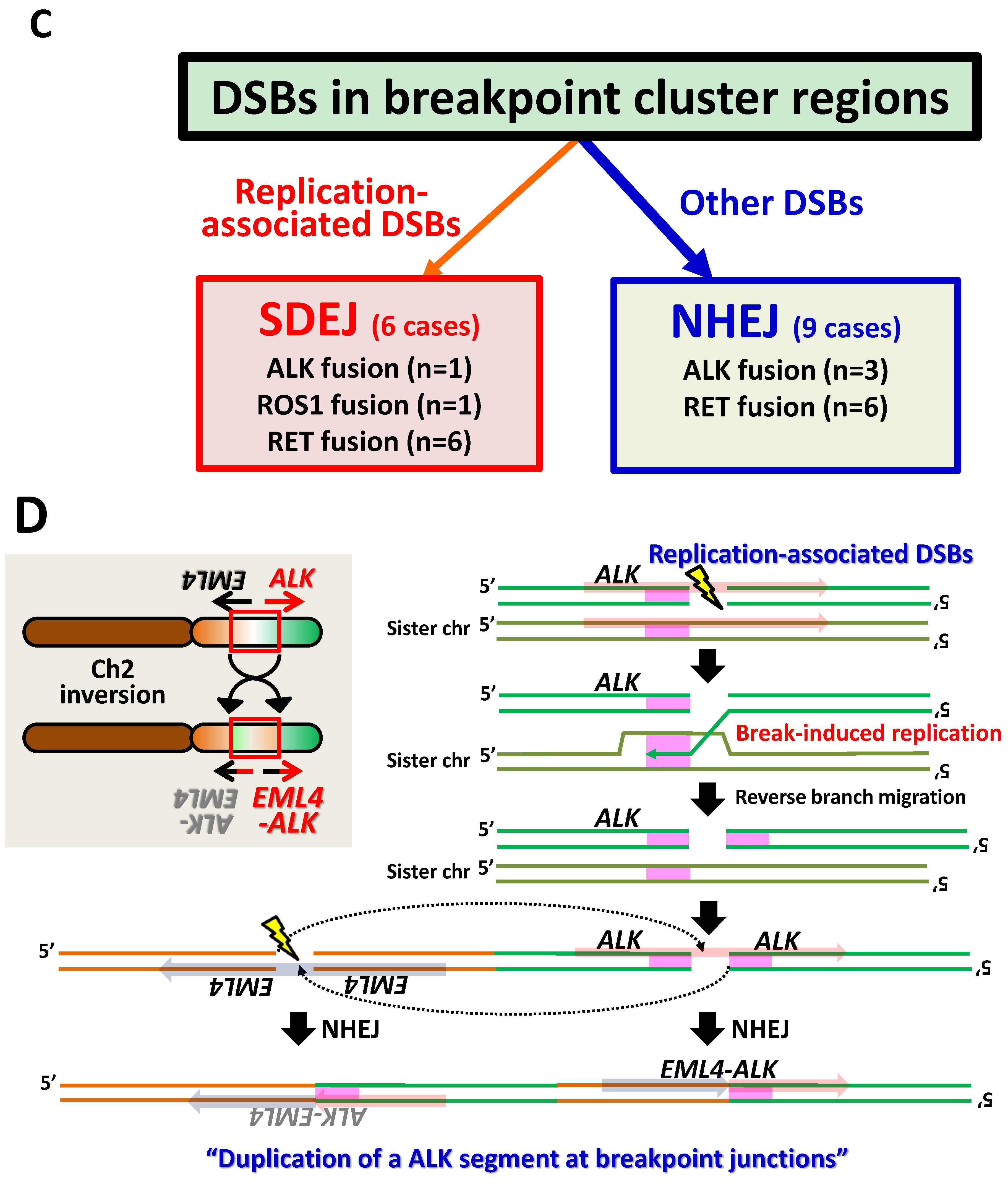 The structure of breakpoint junctions for ALK, ROS1, and RET fusions in LADCs enabled us to deduce the molecular process underlying the chromosome rearrangements that produce gene fusions. First, DSBs occur in a few defined regions, but at non-specific sites within these regions. DSBs are generated both in replicating and non-replicating cells. Second, illegitimate repair of DNA ends by canonical NHEJ or SDEJ causes chromosome rearrangements that produce gene fusion, depending on the type of DSBs (Figure 3C).