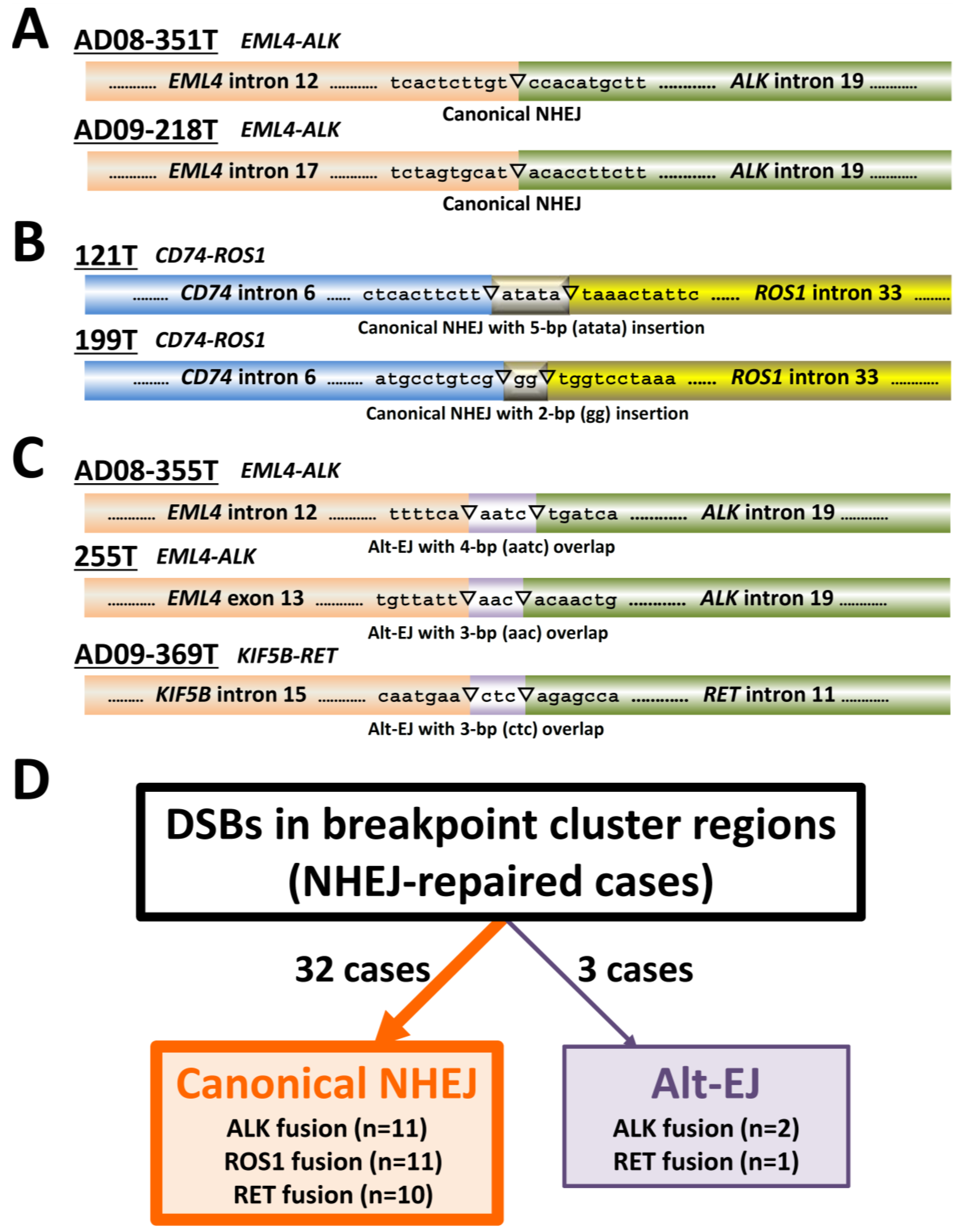 Figure 4. Deduction of non-homologous end joining (NHEJ) modes based on the structures of breakpoint junctions. (A and B) Representative cases in which reciprocal fusion was deduced to be caused by canonical NHEJ. Joining was performed without (A) and with (B) nucleotide insertions. (C) Representative cases in which reciprocal fusion was deduced to be caused by alt-EJ. Joining was deduced to involve microhomologies of three or four base pairs. C, NHEJ causing gene fusions in LADC. Canonical NHEJ is a major NHEJ mode used for DNA end-joining.