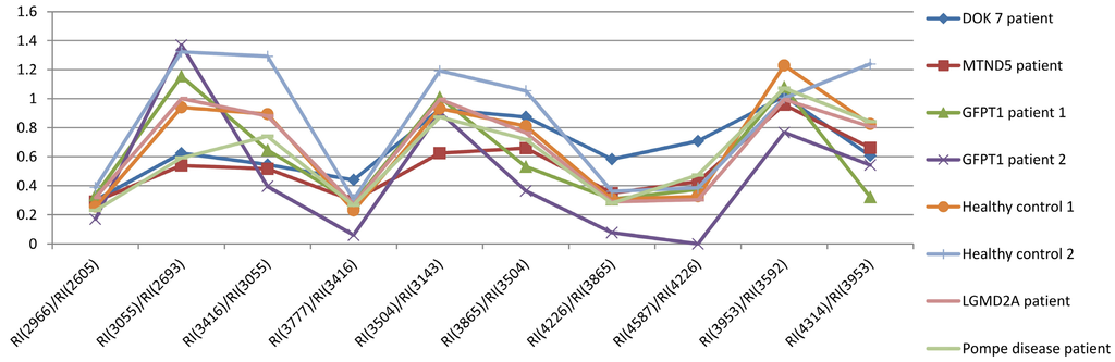 In addition, analysis of myotubes reveals that there is no significant difference in the MALDI profiles from GFPT1 patients, healthy controls, and the other muscle disease patients studied.