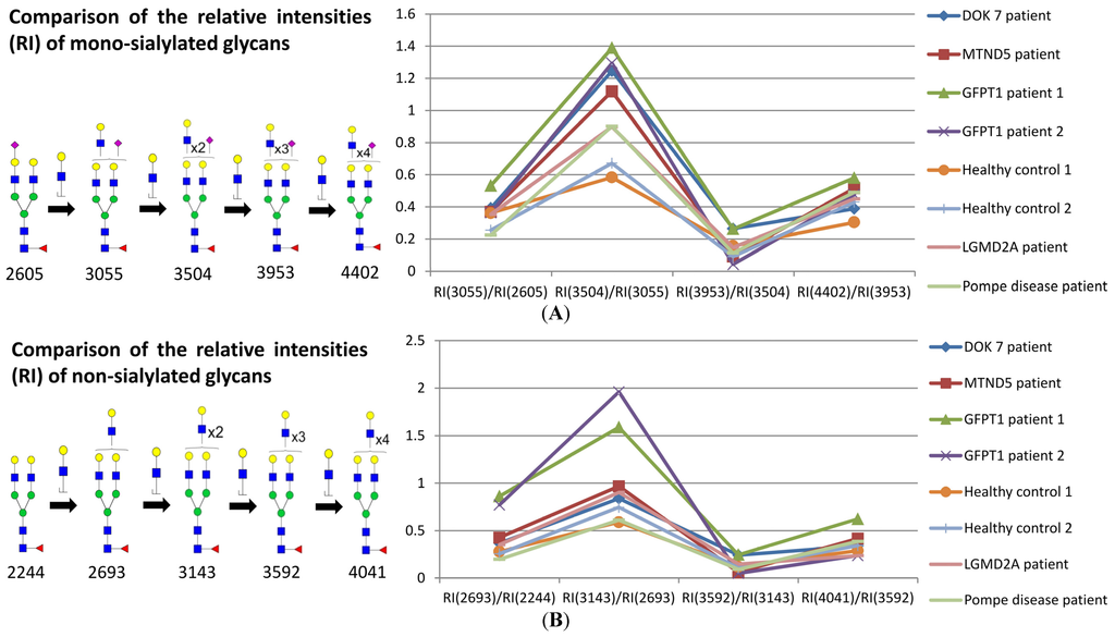 For each family of sialylated glycans we then compared the abundance ratios of pairs of glycans differing in composition by a single LacNAc moiety. For example Figure 3 shows comparative data for mono-sialylated (panel A) and non-sialylated (panel B) glycans containing from two to six LacNAc units. All samples showed a similar profile of relative abundances, albeit there is a two to three-fold divergence of ratios when comparing four LacNAcs with three LacNAcs (for example m/z 3504 and 3055, panel A), with the GFPT1 samples showing somewhat higher levels of the former than observed in the other samples.