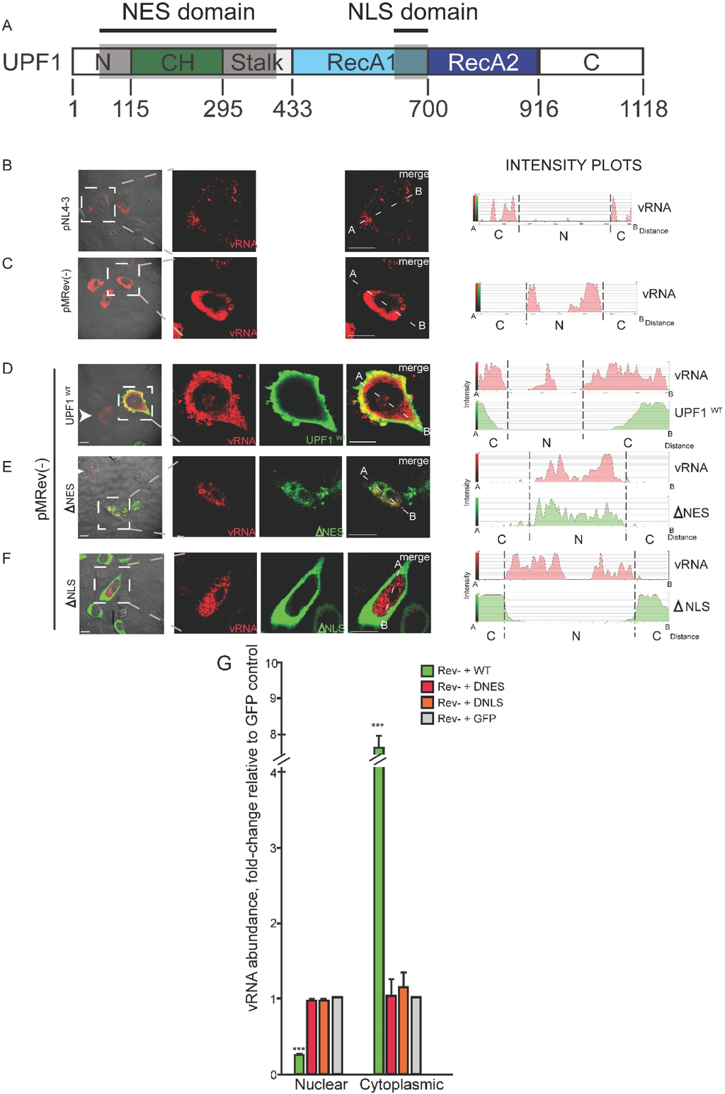 UPF1 nucleocytoplasmic shuttling promotes vRNA nucleocytoplasmic export (A); The UPF1 nuclear export and localization sequence (NES, NLS) domains are shaded in the depiction of UPF1. HeLa cells were co-transfected with wildtype proviral DNA (PNL4-3) alone (B); or a Rev-defective provirus pMRev(−) alone (C); or with UPF1WT (D); UPF1ΔNES (E); and UPF1ΔNLS (F). vRNA shown in red and UPF1 proteins are shown in green (in all panels). White arrowheads identify HIV-1-transfected cells. Size bars indicate 10 µm. The corresponding Intensity plots for vRNA (red) and GFP-tagged UPF1 protein staining are shown from point A to B in the designate cells: dashed lines demarcate the nucleus (N) and cytoplasm (C) boundaries. Imaging results shown are representative of the phenotypes observed in >85% cells in each condition in 5 independent experiments. (G) Dunnett post-test analyses on vRNA localization results ±SEM values compared to the controls pNL4-3+GFP (pNL4-3) or GFP (Rev−); *** p < 0.001.