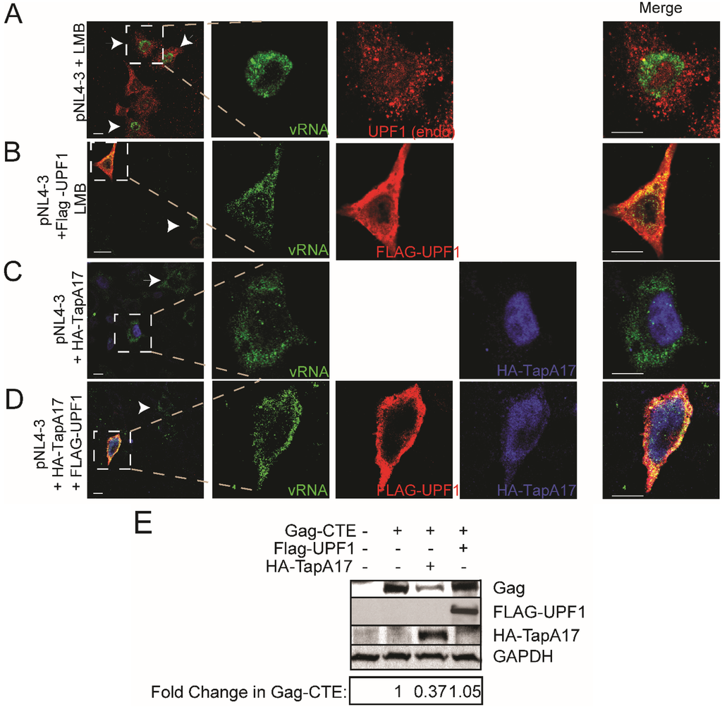 UPF1 exports vRNA via CRM1 and not the NXF1 export pathway. HeLa cells were transfected with pNL4-3 alone and treated with LMB (A); co-transfected with Flag-UPF1 and treated with LMB (B); co-transfected with HA-TapA17 (C); or co-transfected with HA-TapA17 and FLAG-UPF1 (D). FISH/IF co-analyses to identify the localization of vRNA (green in all rows), either endogenous UPF1 (red, A) or FLAG-UPF1 expressed in trans (red, B and D) or HA-TapA17 (blue in C and D). Merged renditions are shown on right-most panels. White arrowheads identify cells exhibiting LMB-induced block to nuclear vRNA export in (in A and B) and cells expressing HIV-1 (in C and D). Imaging results are representative of the phenotypes observed in 78%–85% cells in each condition in 3 experiments. Size bars, 10 µm; (E) Western blot analysis for Gag, FLAG-UPF1, HA-TapA17 and GAPDH (loading control). ImageJ was used to quantify the relative expression levels of Gag (normalized to GAPDH levels). Results shown represent averages from 2 independent experiments with <10% deviation between experiments. nd: not detectable.