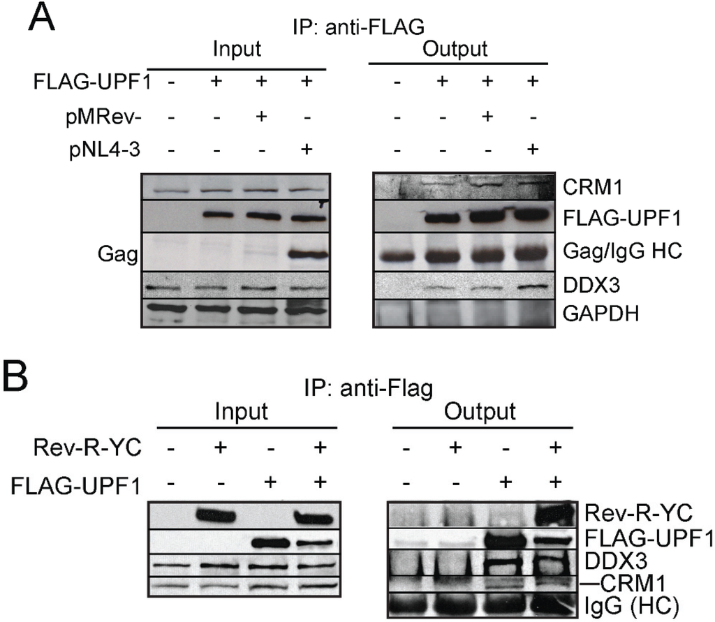 UPF1 is found in complex with Rev-CRM1-DDX3-Nup62. (A) HeLa cells were mock transfected with pCI-FLAG or transfected with FLAG-UPF1 alone or with either pMRev− or Rev+ pNL4-3 DNAs. FLAG-UPF1 was immunoprecipitated as described in Materials and Methods. Input lysates and bound complexes were analyzed by western blotting for CRM1, FLAG-UPF1, Gag, DDX3 and GAPDH (loading and output control). HC: Heavy Chain IgG. Results shown are representative of three independent experiments; (B) HeLa cells were mock transfected with pCI-FLAG or FLAG-UPF1 or co-transfected with FLAG-UPF1 and Rev-R-YC. FLAG-UPF1 was immunoprecipitated and western blotting of input lysates and bound complexes for Rev, FLAG-UPF1, DDX3 and CRM1. HC: Heavy Chain IgG; (C) HeLa cells were mock transfected with pCI-FLAG or transfected with FLAG-UPF1. Cells were harvested and FLAG-UPF1 was immunoprecipitated as described in Materials and Methods. Western blotting analysis for FLAG-UPF1 and Nup62. IgG HC: IgG heavy Chain; (D) Glycerol gradient analyses of UPF1 complexes in HIV-1-expressing cells. HIV-1/FLAG-UPF1-expressing cells were immunoprecipitated with anti-FLAG serum. FLAG-UPF1 complexes were eluted and fractionated on a glycerol gradient. Fractions were collected and FLAG-UPF1, pr55Gag, CRM1 and UPF3b were probed in each fraction by Western blotting. vRNA abundance is shown on the bottom panel, as determined by slot blot analyses; (E) HeLa cells were mock transfected with pCI-FLAG or co-transfected with HIV-1 and FLAG-UPF1. At 30 h post--transfection, Gag was immunoprecipitated using monoclonal anti-p24 antisera. Western for UPF1 (FLAG), Gag, CRM1, Nup62 and DDX3 were performed. Light Chain IgG.