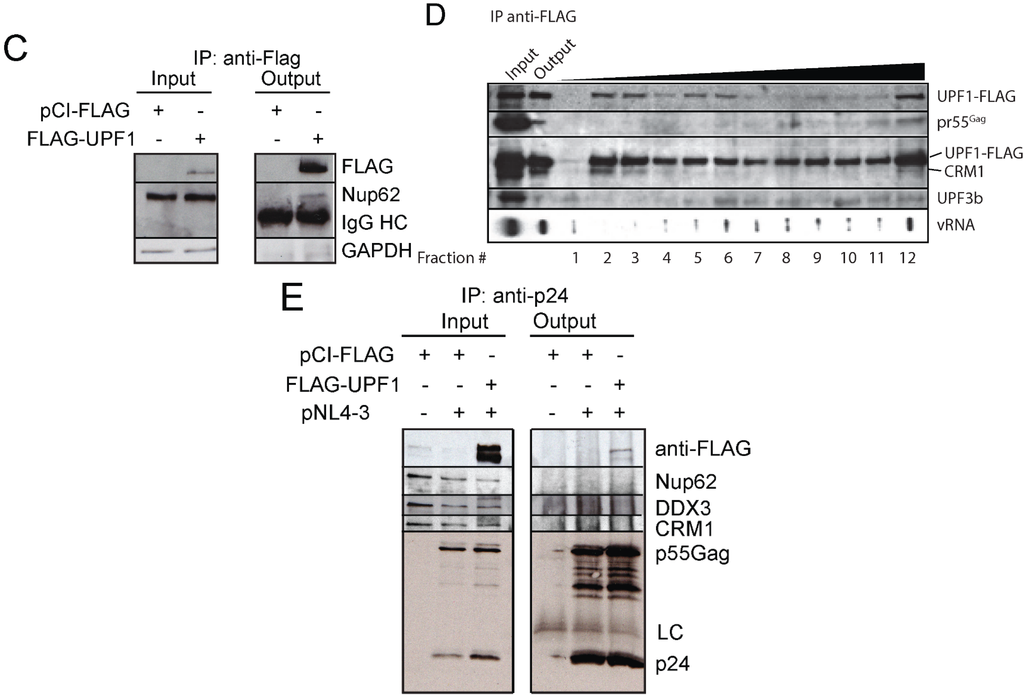 HIV-1 encodes the regulatory viral protein Rev to export singly-spliced RNAs and the unspliced, vRNA to the cytoplasm [9]. Rev binds to the vRNA via an interaction between its NLS domain and the RRE element of the vRNA directing it through the nuclear pore via an interaction with CRM1 and nucleoporins [10,78,79]. Because our results highlight the importance of the shuttling function of UPF1 in vRNA export in both Rev-dependent and -independent conditions, we attempted to identify if UPF1 was present in the RNP complex required for vRNA nucleocytoplasmic export. To do this, we overexpressed FLAG-UPF1WT with or without a Rev expressor (Rev-R-YC) and immunoprecipitated FLAG-UPF1WT. Rev, DDX3 and CRM1 all co-immunoprecipitated with UPF1WT in the presence and absence of Rev (Figure 4B). In earlier published work, we showed that the depletion of Nup62 resulted in a block to vRNA nuclear export and Nup62 was also found to be part of the HIV-1 Rev RNP complex [10,15]. We therefore sought to determine if UPF1 could also co-precipitate with Nup62. Indeed, Nup62 was also found to be part of the UPF1 RNP strengthening the role of UPF1 in vRNA export (Figure 4C). In order to reinforce the notion that UPF1 is involved in vRNA export and is present in two different complexes, we also performed glycerol gradient analysis on immunoprecipitated UPF1 complexes in HIV-1 positive conditions and found that in lighter fractions UPF1 is associated with CRM1 and the HIV-1 vRNA and in the more dense fractions it is associated with CRM1, UPF3b, Gag and vRNA, similar to the Staufen1-HIV-1 RNP complex [5,45,80] (Figure 4D). In addition, DDX3, CRM1 and Nup62 were all absent from the HIV-1 Gag RNP complex as determined by co-IP analysis using anti-p24 [26] (Figure 4E) suggesting that UPF1 is found in at least two different HIV-1 RNPs: the first being composed of the vRNA and nucleocytoplasmic export factors such as CRM1, Rev, Nup62 and DDX3, most likely a nuclear RNP complex, and a second UPF1 cytoplasmic complex that includes Gag and a variety of other cytoplasmic proteins likely to be important for viral assembly, as we have proposed [5].
