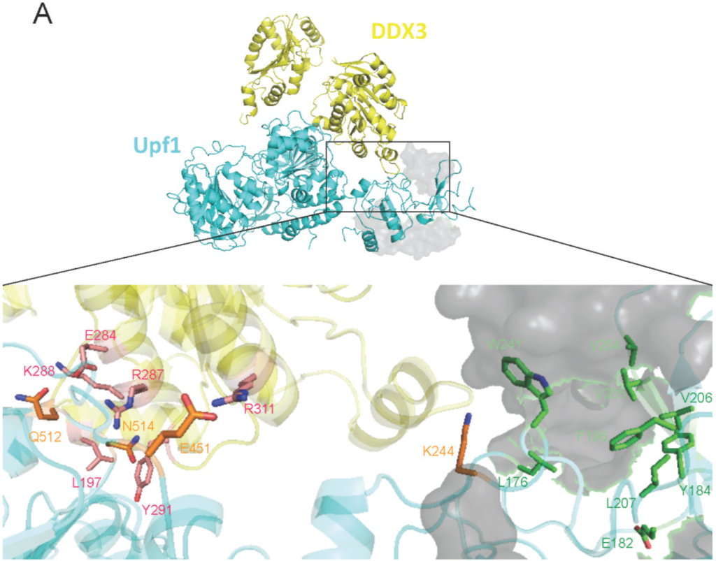 In the UPF1-DDX3 complex, we observed a wide surface of contact between the RecA-like domain 1 of DDX3 and the RecA-like domain 1A and the CH-domain of UPF1 (Figure 5A, upper panel). A structural alignment between the modeled structure of the UPF1-DDX3 complex and the structure of the UPF1-UPF2 complex [53] indicates that there is no apparent interference between DDX3 and UPF2 for binding UPF1 (Figure 5A, upper panel). Then, to understand the interaction between UPF1 and DDX3 at the molecular level, we perform an in silico alanine scanning using the Rosetta server as described in materials and methods [72]. We identified residues in the UPF1 Rec-like domain 1A domain (E451, N514 and Q512) and CH-domain (K244) as relevant for the interaction with DDX3 (Figure 4A, bottom panel). We also identified residues L197, E284, R287, K288, Y291 and R311 in the Rec-like domain 1 of DDX3 as relevant for the interaction with UPF1 (Figure 5A, bottom panel). Residues in UPF1 previously described as critical for its interaction with UPF2 [53,83] are shown in green (Figure 5A, bottom panel). Of note, our alanine scanning also identified UPF1 residue W241, a residue involved in UPF2 binding [53,83] as relevant for interaction with DDX3 suggesting a partial overlap between DDX3 and UPF2 that could interfere with binding of the latter (Figure 5A, bottom panel).