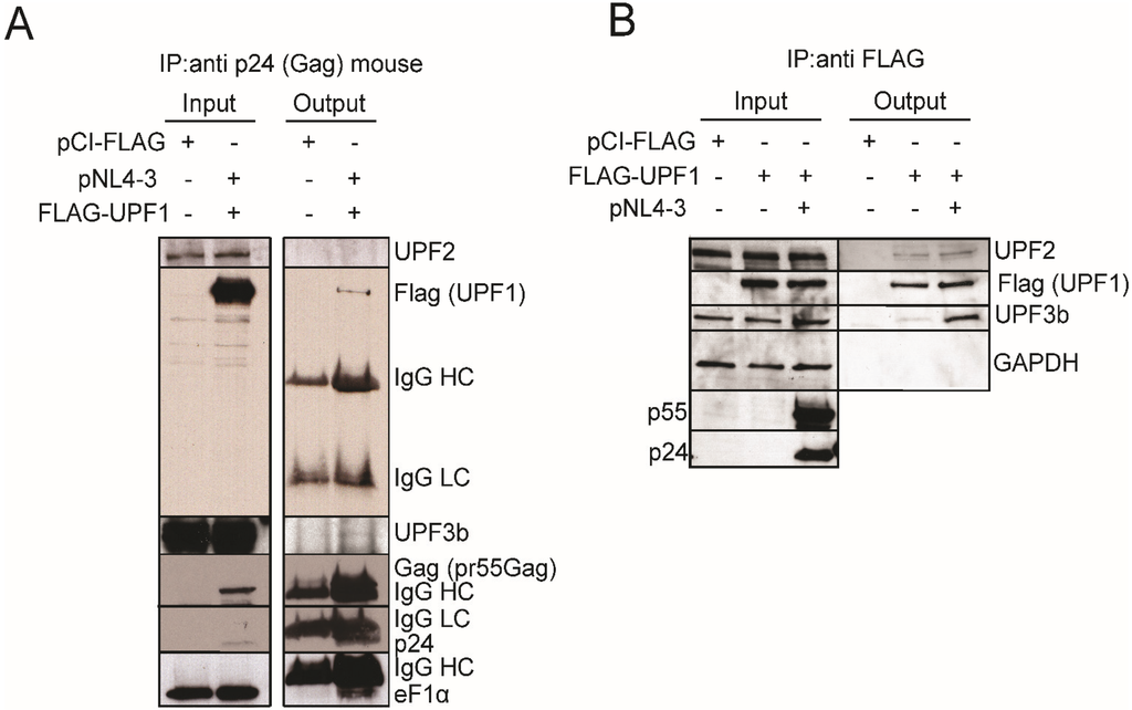 UPF2 is absent from the HIV-1 Gag RNP and UPF3b co-immunoprecipitates with UPF1 under HIV-1 conditions. (A) HeLa cells were mock transfected with pCI-FLAG or co-transfected with proviral pNL4-3 DNA and FLAG-UPF1WT. At 30 h post-transfection, cells were harvested and Gag was immunoprecipitated using a monoclonal anti-p24 antiserum as described in Materials and Methods. Western blot analysis for FLAG-UPF1, UPF3b, Gag (pr55Gag), UPF2, and eF1α (positive control) was performed. HC: IgG Heavy Chain. LC: IgG Light Chain. Results are representative of two experiments. (B) HeLa cells were mock transfected with pCI-FLAG or FLAG-UPF1 or co-transfected with HIV-1 pNL4-3 DNA. Cells were harvested and FLAG-UPF1 was immunoprecipitated. Input lysates and bound complexes were analyzed by western blotting for UPF2, FLAG-UPF1, UPF3b, GAPDH (loading and output control) and Gag (pr55Gag). Results shown are representative of three independent experiments. HC: IgG Heavy Chain, LC: IgG Light Chain.