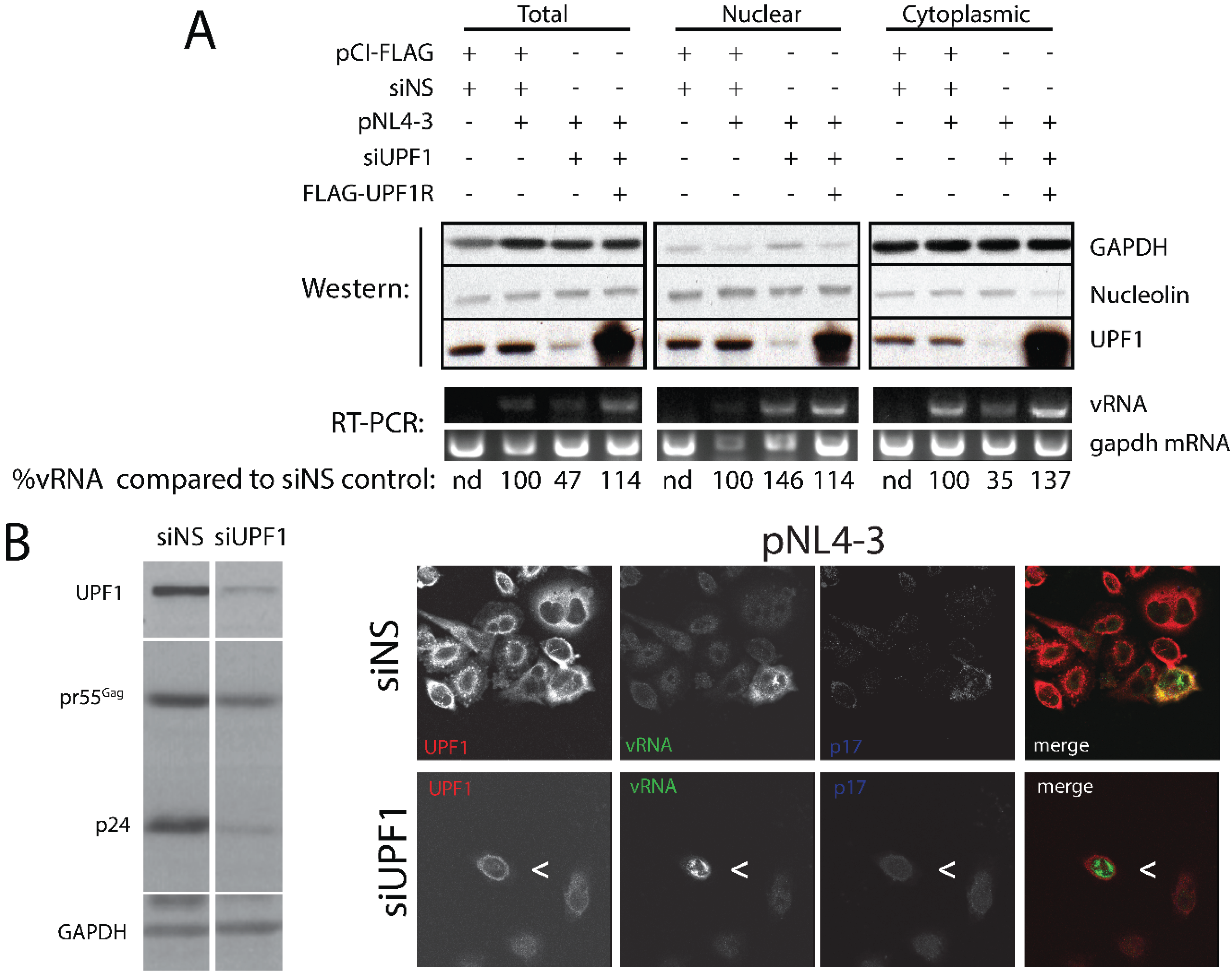 UPF1 depletion increases the abundance of vRNA in the nucleus while UPF1 Rescue enhances cyto-plasmic vRNA levels. (A) HeLa cells were mock transfected with pCI-FLAG and non-silencing siRNA (siNS) or co-transfected with HIV-1 proviral pNL4-3 DNA and pCI-FLAG and siNS. UPF1 was depleted by siUPF1 and UPF1 expression was rescued with FLAG-UPF1Rescue (UPF1R). At 30h post-transfection, cells were harvested and cytoplasmic-nuclear fractionation analysis was carried out as described in Materials and Methods. Western blot analysis was performed GAPDH (enriched in the cytoplasmic), Nucleolin (enriched in the nucleus), and UPF1 (identifying endogenous and overexpressed proteins). RNA was isolated from cell extracts and steady-state levels of vRNA and gapdh mRNA was measured by RT-PCR. vRNA levels were quantified by densitometry with ImageJ using gapdh mRNA signal intensity for normalization; pNL4-3 + siNS condition was set at a 100%. nd, not detectable. (B) Cells were mock-depleted with nonsilencing siRNA (siNS) or depleted using siUPF1 as described in Materials and Methods. At 40–48 h post-transfection, cells were harvested for western blotting for UPF1 (endogenous), Gag (identifying pr55Gag and p24) and GAPDH (loading control) (on left) and FISH/IF co-analyses for UPF1 (red), vRNA (green) and Gag (blue) (with merged renditions on right). UPF1 depletion led to decreased Gag expression as shown earlier (left panel; Ajamian et al., 2008) but also led to a blockade to vRNA nuclear export (white arrowhead < in lower row of right panel) in >80% cells examined (n = 48). See results for additional discussion of these findings.