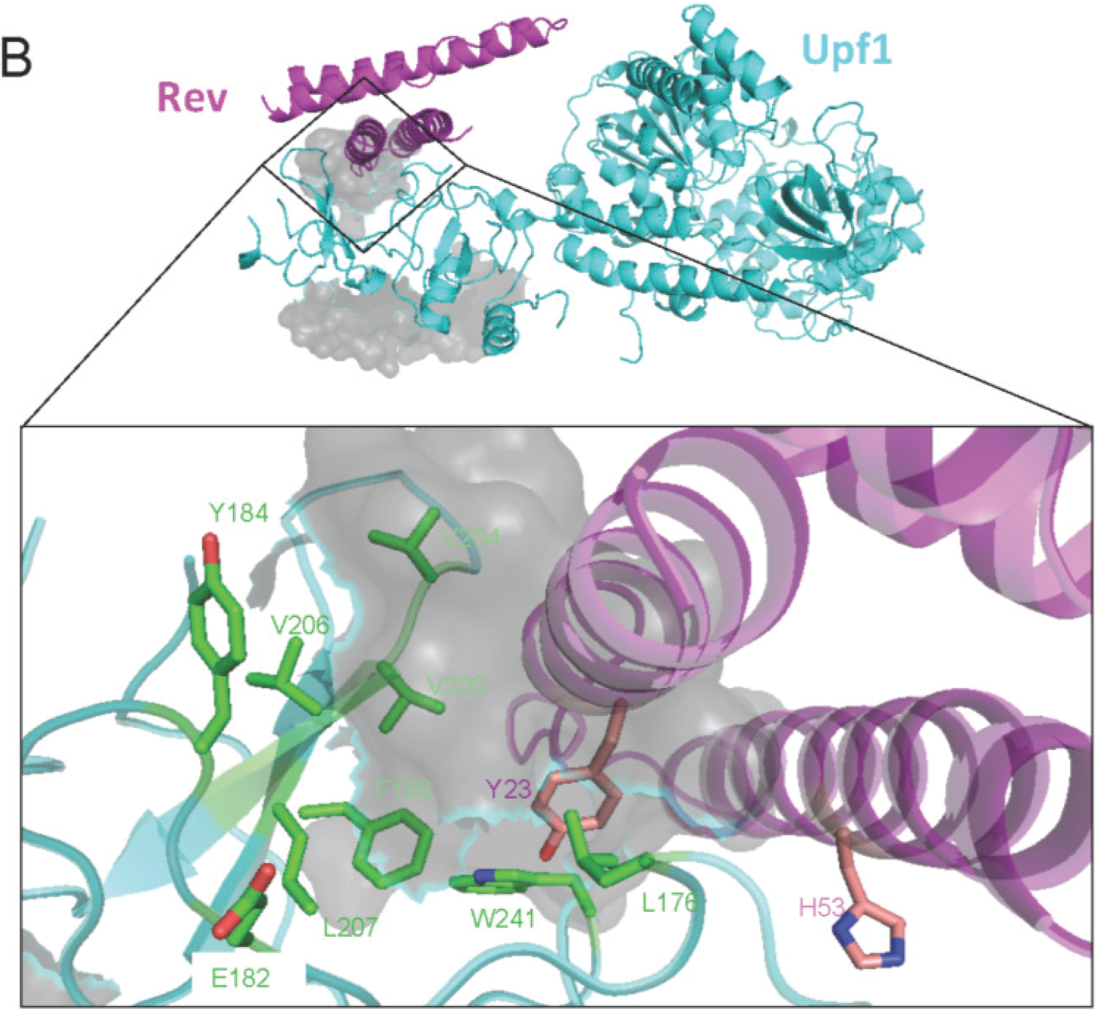In the Rev-UPF1 model, we observed that one of the monomers of Rev interacts with the CH-domain of UPF1, a region described as critical for interaction with UPF2 [53,83]. Indeed, our structural alignment revealed that Rev could bind UPF1 at the same region that binds the β-strand of UPF2 (Figure 5B, upper panel). Such a secondary structure in UPF2 was described as the most relevant for its interaction with UPF1 as mutations in the β-strand results in the disassembly of the UPF1-UPF2 complex [53,83]. Interestingly, two residues in UPF1 important for its interaction with UPF2 (W241 and L176) were identified by alanine scanning as relevant for Rev binding (Figure 5B, bottom panel). Moreover, our model also shows that additional residues in UPF1 that are relevant for its interaction with UPF2 such as F196, V204 and V05 could be completely masked by Rev (Figure 5B, bottom panel). Despite the limitations of our modeling analyses, it appears that in the context of HIV-1 infection, Rev could interfere with the formation of an UPF1-UPF2 complex, without interfering with the UPF1-DDX3 interaction. This nicely correlates with our previous work indicating that UPF2 is not required for the UPF1-mediated stimulation of HIV-1 expression and provides molecular insights into the how UPF2 is excluded from the UPF1 complex assembled during HIV-1 replication [5,45] (and see below). Nevertheless, biochemical analyses using mutants are required to validate the residues that are important for the UPF1-DDX3 and UPF1-Rev interaction.