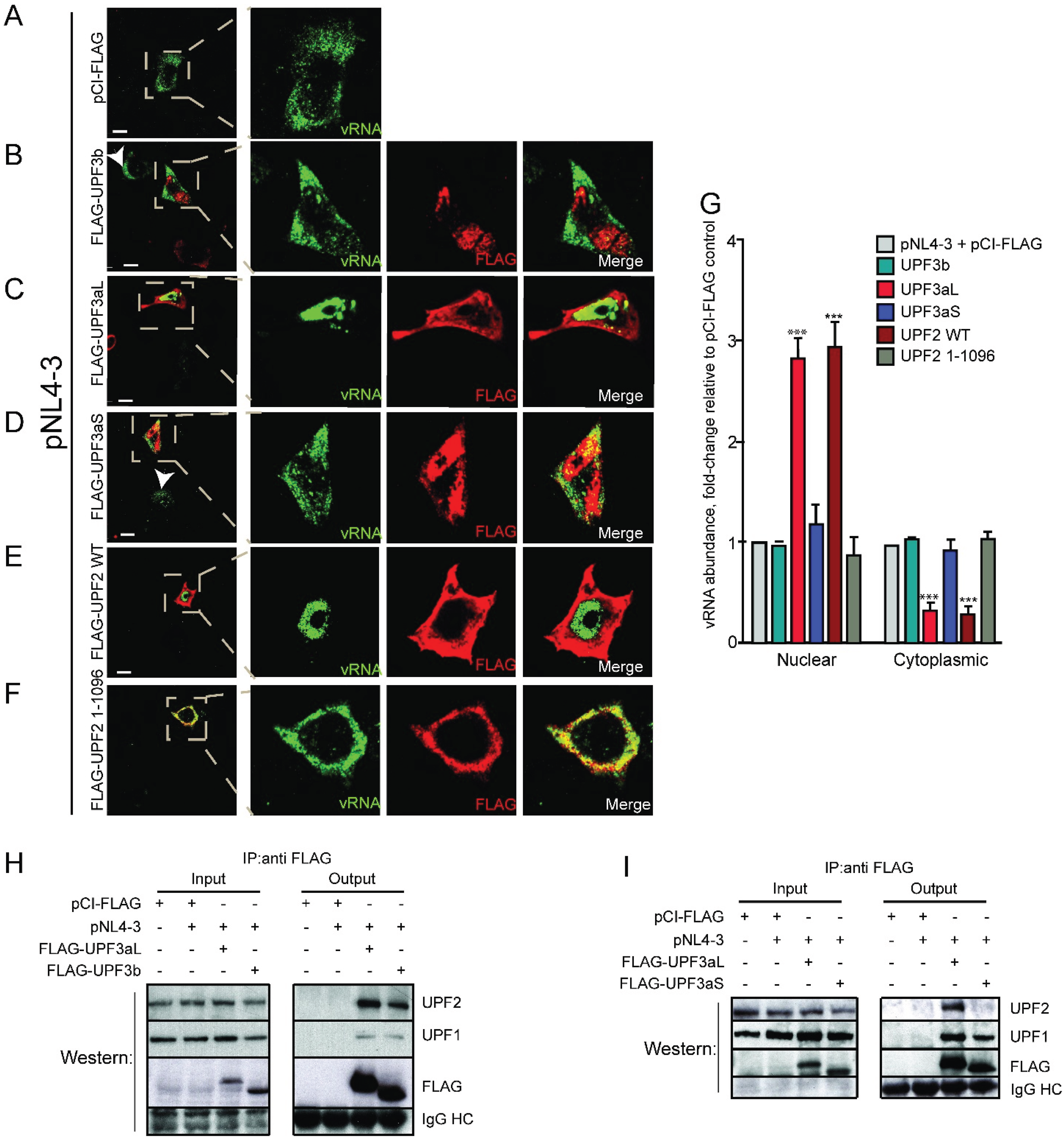 UPF3b and UPF3aL undergo a unidirectional regulation which is dependent on the availability of UPF2. Since UPF2 is excluded from the HIV-1 RNP, we hypothesized that UPF2 binding to UPF3aL with UPF1 mediates the blockade to vRNA nuclear export. We therefore overexpressed the UPF3aL mutant, FLAG-UPF3aS, that does not interact with UPF2 but is a component of a complex containing UPF1 (but not UPF2), and examined vRNA localization by FISH/IF co-analyses (Figure 7D). In contrast with what was observed with UPF3aL, overexpression of FLAG-UPF3aS did not lead to the nuclear localization of the vRNA (Figure 7D). We then overexpressed FLAG-UPF3aL and FLAG-UPF3aS with proviral pNL4-3 DNA, immunoprecipitated these complexes using an anti-FLAG antibody and blotted for the presence of FLAG, UPF1 and UPF2 (Figure 7I). As expected, UPF1 co-immunoprecipitated with both UPF3aL and UPF3aS, but the UPF2 binding mutant, UPF3aS, did not pull down UPF2. Thus, it seems that UPF2, UPF3aL and UPF1 in complex are detrimental to HIV-1 expression by trapping the vRNA in the nucleus, while UPF3aS in complex with UPF1 does not have this effect due to the fact that it does not bind UPF2. Given that our results point to a negative regulation of vRNA export by UPF2, we decided to express wild type UPF2 (FLAG-UPF2) and a mutant of UPF2 which does not bind UPF1 (FLAG-UPF21–1096, which has a deletion at the C-terminus) with proviral DNA pNL4-3 and assessed vRNA localization by FISH/IF co-analyses (Figure 7E,F). Wild type UPF2 blocked vRNA nuclear export (Figure 7E), similar to what was found for UPF3aL. The C-terminal mutant UPF21–1096 exhibiting a complete loss of UPF1 binding failed to block vRNA export (Figure 7F). A point mutant of UPF2 (UPF21173), which exhibits an incomplete association to UPF1, resulted in a clear 50% phenotype between nuclear and cytoplasmic localization of the vRNA ([73], see below). These results show that UPF2 blocks vRNA nucleocytoplasmic export by associating with UPF1.