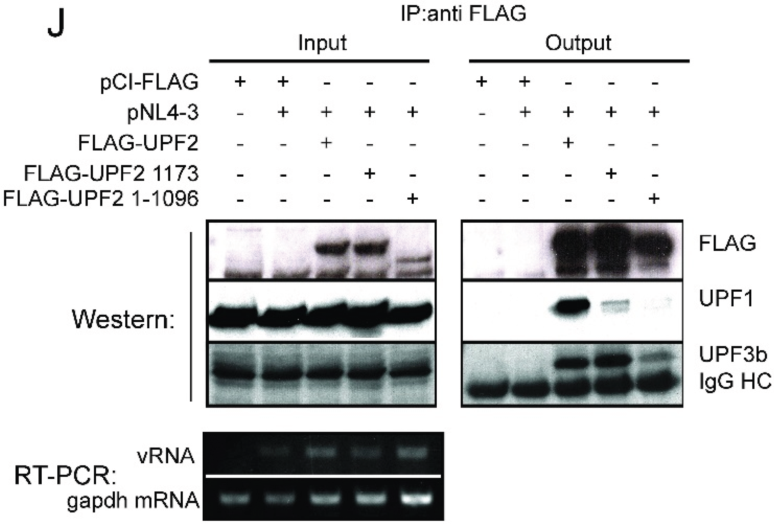 Since the C-terminal domain of UPF2 binds the N-terminal CH-domain of UPF1 [48], we therefore decided to confirm that the deletion mutant UPF21–1096 does not bind UPF1. Our results show that all of the UPF2 constructs immunoprecipitated with UPF3b but bound UPF1 differentially (Figure 7J). UPF1 immunoprecipitated with wild type UPF2 but weakly with, UPF21173 explaining in part why there was only a partial 50% blockade to nuclear export of the vRNA (n > 50, in 3 independent experiments; [73]), despite a quantitative immunoprecipitation of FLAG-UPF2 proteins. On the other hand, UPF1 failed to immunoprecipitate with the C-terminal mutant of UPF2 (UPF21–1096; Figure 7J) correlating with the loss in the ability to block the nuclear export of the vRNA. There was no significant change in vRNA levels under these conditions (Figure 7J, bottom). Importantly, it was shown that UPF21–1096 was still able to bind UPF3aL and UPF3b despite its inability to bind UPF1 [48]. The characteristics and binding partners of UPF3 and UPF2 wild type and mutants used as well as a summary of their effects on Rev+ HIV-1 vRNA export are summarized in Table 2. These results demonstrate that the UPF3aL/UPF2-UPF1 association blocks vRNA nuclear export (Figure 7G) and that HIV-1 excludes UPF2 from its binding to UPF1 in order for UPF1 to promote HIV-1 vRNA export together with Rev, CRM1 and DDX3.