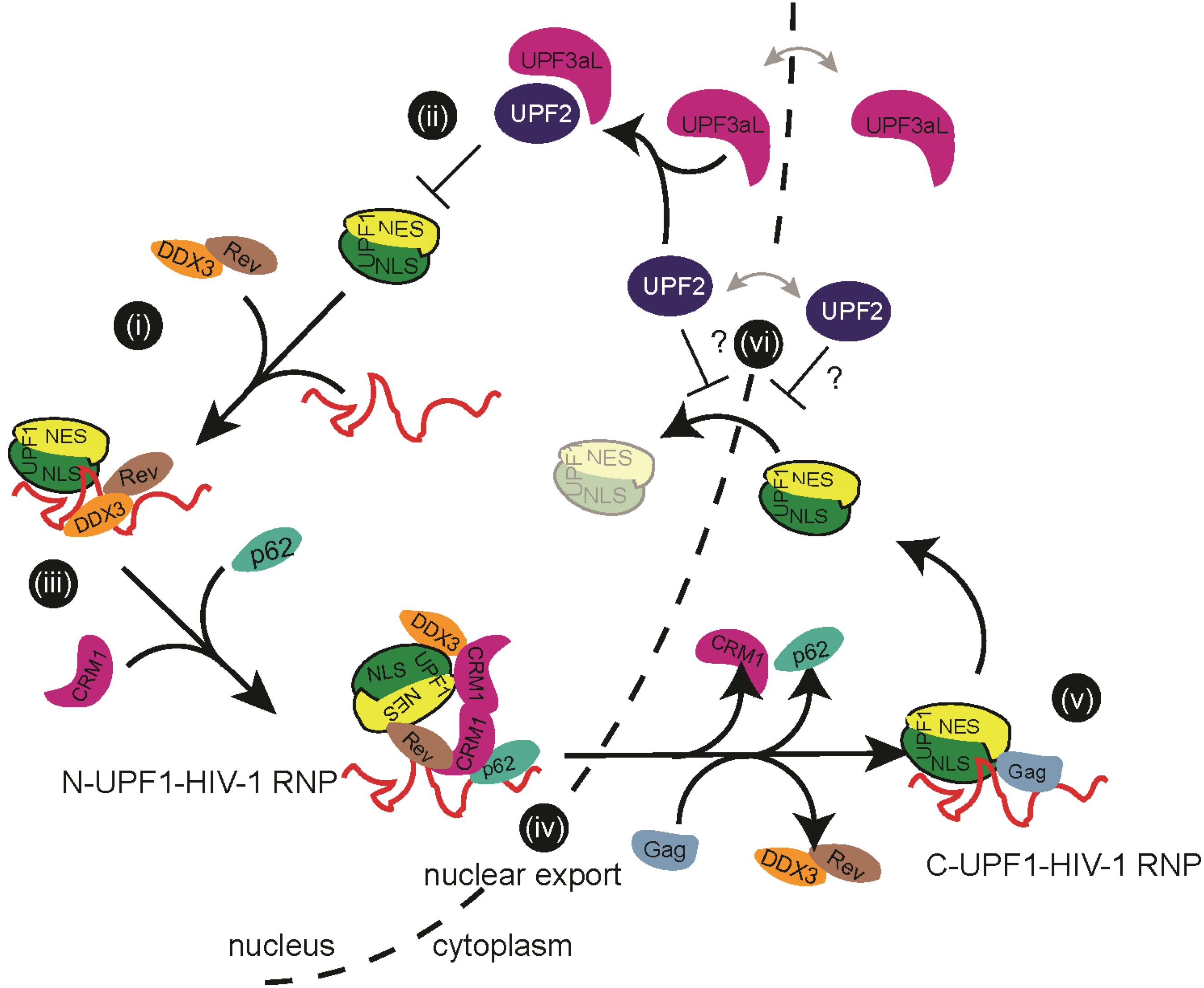 Proposed model for UPF1-mediated vRNA nucleocytoplasmic export. During the HIV-1 expression phase, the shuttling ability of UPF1 is important for vRNA nucleocytoplasmic export. In the nucleus, UPF1 can be recruited to the vRNA via its C-terminal domain (including the NLS domain, Figure 1A) and acts as an adaptor protein to bridge the nuclear HIV-1 RNP with export factors through, most likely, its NES region (i). However, UPF3aL can potentially block the recruitment of UPF1 to prevent the assembly of an export-competent nuclear RNP by recruiting UPF2 (ii). Once assembled, the UPF1 nuclear export complex, composed of the vRNA, UPF1, Rev, CRM1, DDX3 and DDX1 then associates with nucleoporins Nup98 and/or Nup214, as well as Nup62 to form a nuclear complex (N-UPF1-HIV-1 RNP, (iii)). This complex can then be efficiently exported (iv). Once in the cytoplasm, several factors including UPF1 recycle back to their original locations. UPF1 can either act in the context of a cytoplasmic RNP (C-UPF1-HIV-1 RNP) to promote vRNA stability and utilization (translation) to ensure Gag synthesis (v), or, according to the current results in this manuscript, escapes interaction with UPF2 (vi) within the cytoplasm or nucleus (“?” indicates open question) to control vRNA nucleocytoplasmic export.