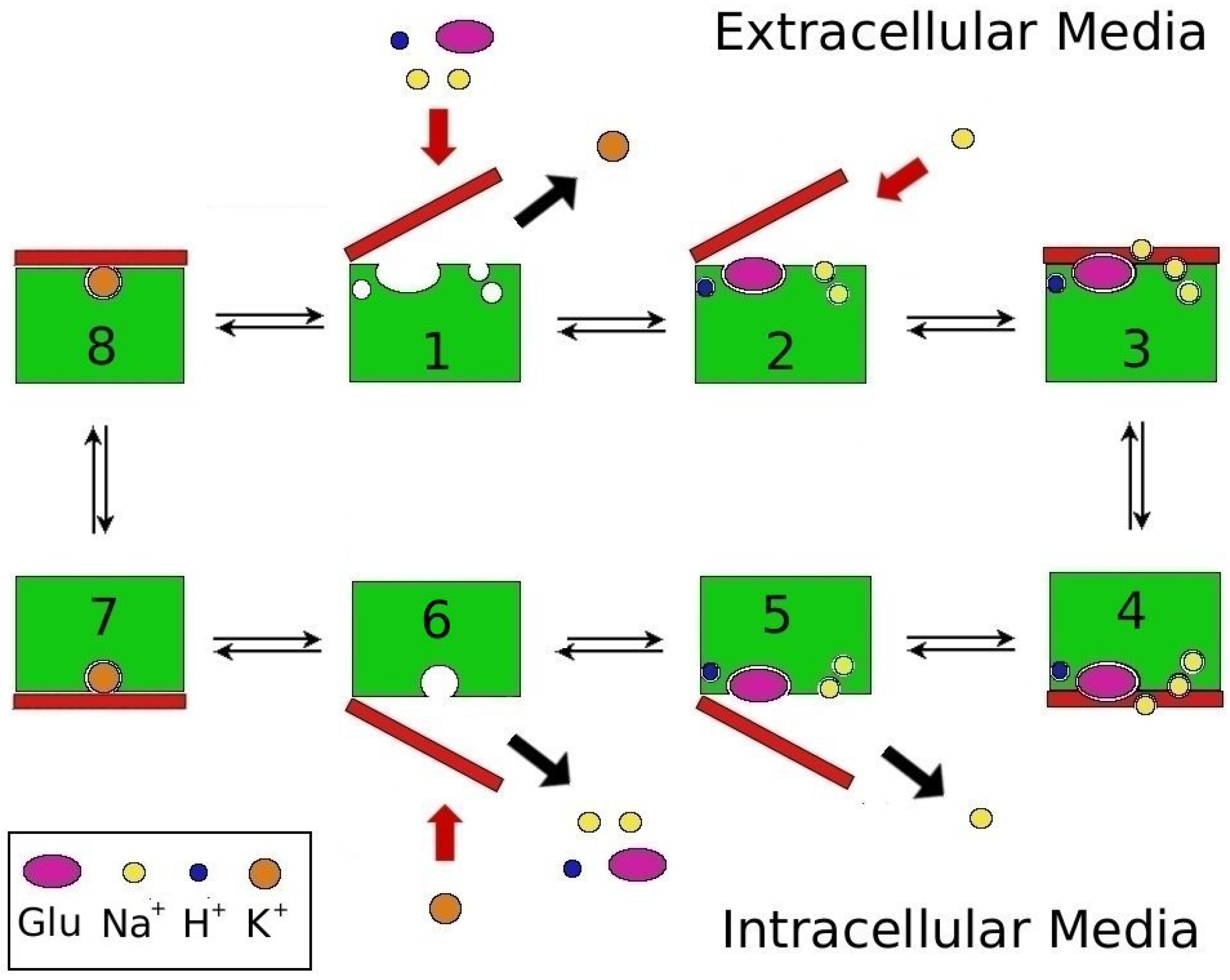 - Glu is stably bound when E374 is protonated but becomes unstable when E374 is deprotonated in both the outward and inward-facing states. Thus binding of Glu is contingent upon the protonation of E374, which is consistent with the experimental observations indicating E374 as the protonation site [65,66].