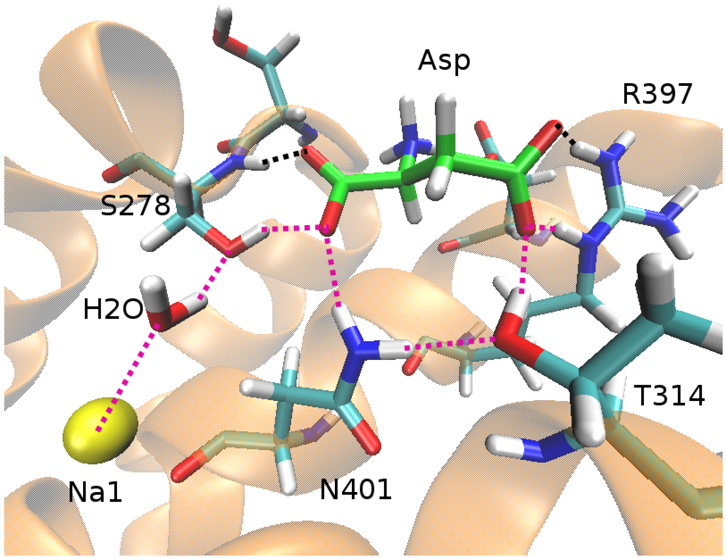 - Venkatasan, S.K.; Saha, K.; Sohail, A.; Sandtner, W.; Freissmuth, M.; Ecker, G.F.; Sitte, H.H.; Stockner, T. Refinement of the central steps of substrate transport by the aspartate transporter GltPh: Elucidating the role of the Na2 sodium binding site. PLoS Comput. Biol. 2015, 11, e1004551. [Google Scholar] [CrossRef] [PubMed]