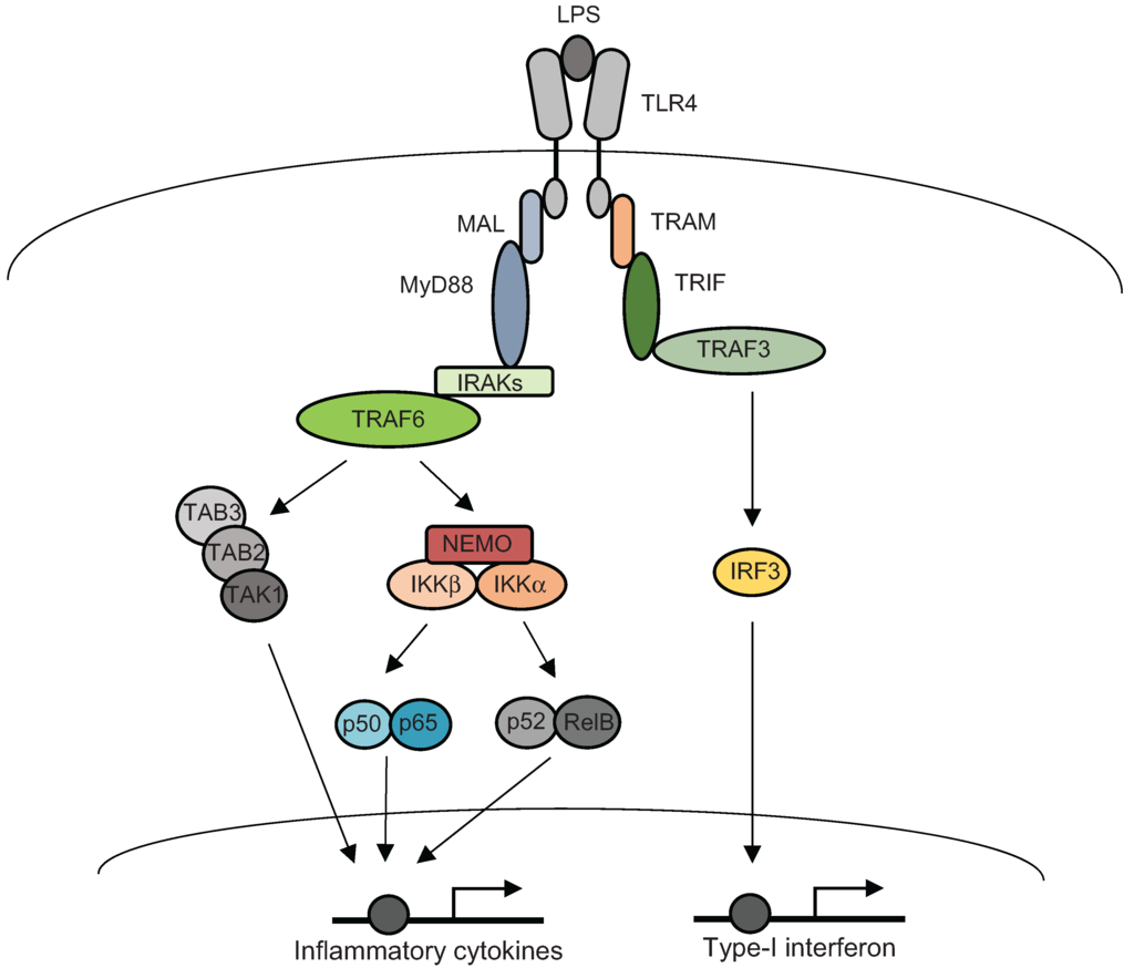 The discovery of the TLRs provided significant insight into how the host initiates inflammatory responses against microbial pathogens [11]. TLRs are type one transmembrane proteins characterized by an intracellular Toll-IL-1 receptor (TIR) domain and extracellular leucine-rich repeats (LRR) motif that recognize specific ligands. Being the prime receptor for bacterially derived lipopolysaccharide (LPS), TLR4 is the most studied among TLRs. Once activated, TLR4 homodimerizes and initiates the downstream signalling cascades by recruiting TIR-containing cytoplasmic adaptor proteins through a TIR-TIR interaction. Most TLRs signal via the universal adaptor protein, myeloid differentiation primary-response protein 88 (MyD88), with the exception of TLR3, which uses TIR domain-containing adaptor protein inducing IFN-β (TRIF), and TLR4, which signals via both MyD88 and TRIF. The signaling pathways emerging from TLR4 can be divided into two categories: MyD88-dependent and MyD88-independent pathways [12]. The MyD88-dependent TLR4 pathway mediates the early response to LPS. This pathway is facilitated by MyD88-adaptor like (Mal), a bridging adaptor required for TLR4-MyD88 interaction. Once bound to the complex, the death domain (DD) of MyD88 recruits IL-1 receptor associated kinases (IRAK1, IRAK2 and IRAK4) via DD-DD interactions. IRAK4 then interacts with IRAK1 to induce its phosphorylation. Phosphorylated IRAK4 dissociates from the complex and interacts with TNF receptor-associated factor six (TRAF6). The interaction of IRAK4 with TRAF6 facilitates the early induction of inflammatory gene transcription via the activation of transcription factors. On the other hand, the MyD88-independent pathway constitutes the late response to LPS and results in the expression of type-1 IFN. MyD88-independent pathway is mediated by TIR domain-containing adaptor inducing IFN-β (TRIF) and the TLR4-TRIF interaction is mediated by a bridging adaptor, TRIF-related adaptor molecule (TRAM). The N-terminus of TRIF recruits TRAF-3 and phosphorylates IRF3, leading to the induction of type-1 IFN [12,13] (Figure 1).