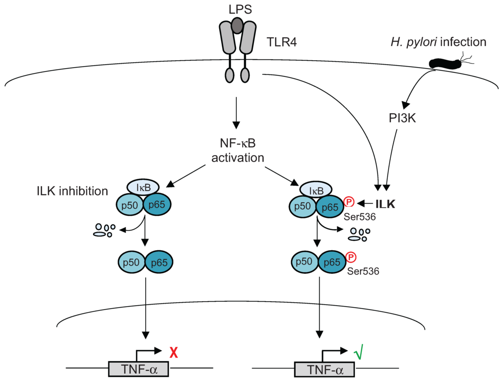 Integrin-linked kinase (ILK) modulates p65 Ser536 phosphorylation and tumour necrosis factor alpha (TNF-α) production in response to LPS and H. pylori infection. For H. pylori infection, the ILK-mediated role is PI3K dependent. Inhibition of ILK (via genetic knockdown or small molecule inhibitor treatment) prevents LPS or H. pylori-induced p65 Ser536 phosphorylation, but IκB degradation and nuclear translocation remain unaffected [42].
