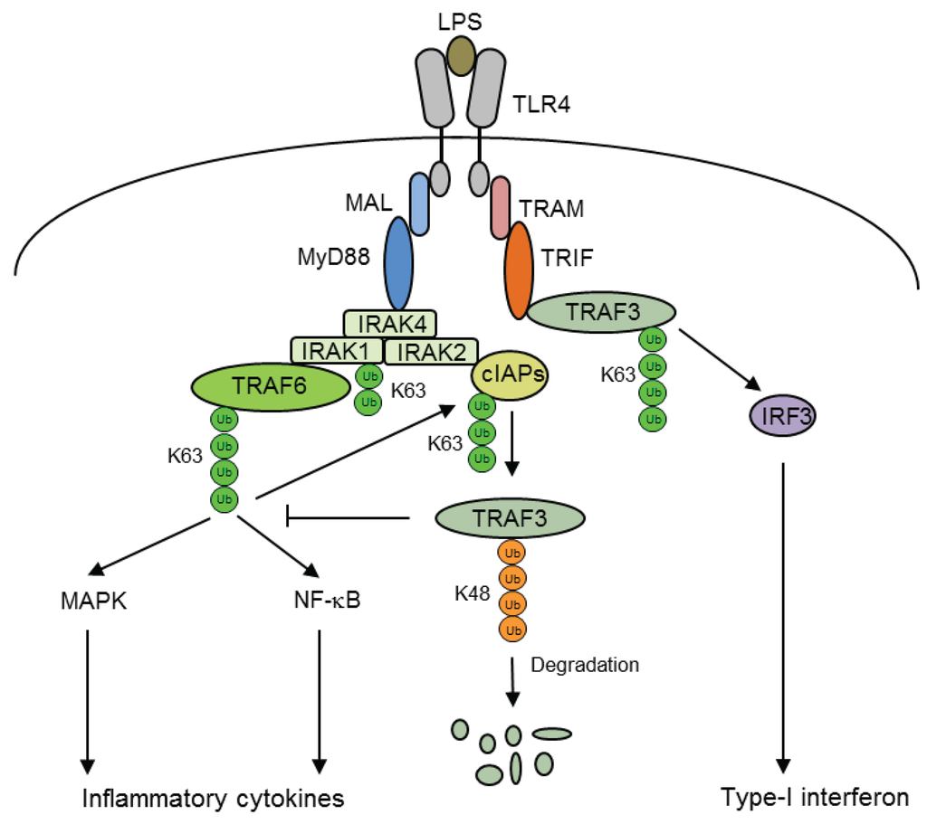 Ubiquitination-mediated signaling cascades in TLR4-induced gene activation. In response to LPS, cellular inhibitor of apoptosis protein (cIAPs) are activated via K63-linked ubiquitination by TNF receptor-associated factor (TRAF) 6. Activated cIAPs target TRAF3 for proteasomal degradation via K48-linked ubiquitination, which is required for LPS-mediated activation of pro-inflammatory cytokines. In MyD88-independent signaling, TRAF3 is activated via K63-linked ubiquitination by TRIF, which is required for IRF3 activation and the IFN response.