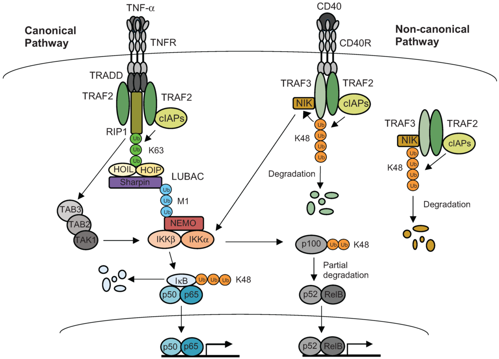 Ubiquitination-mediated signaling cascades in canonical and non-canonical NF-κB pathways. In canonical pathway, binding of TNF-α to TNFR1 triggers recruitment of the adaptor protein TRADD, which stimulates the formation of a complex consisting of TRAF2, RIP1, cIAP1 and cIAP2. Additionally, cIAPs promote K63 linkage-mediated ubiquitination of RIP1, which in turn leads to the recruitment of LUBAC. LUBAC results in stabilization of the complex by further ubiquitination, thereby providing the docking sites of TAB2/TAB3/TAK1 and IKK complexes, as well as their activation. The activation of IKKβ leads to K48-linked polyubiquitination and proteasomal degradation of IκB, thus facilitating liberation of p65/p50. During non-canonical activation (e.g., CD40 ligation), cIAP1/2 are recruited to receptor complexes by TRAF2 where they target TRAF3 for K48-linked ubiquitination and proteasomal destruction, thereby facilitating the release of NIK. The accumulated NIK phosphorylates IKKα, which in turn leads to a partial degradation of p100 to p52, facilitating nuclear translocation of RelB:p52 dimer. Under resting conditions, NIK is consistently targeted by cIAPs for K48-linked ubiquitylation and subsequent degradation.