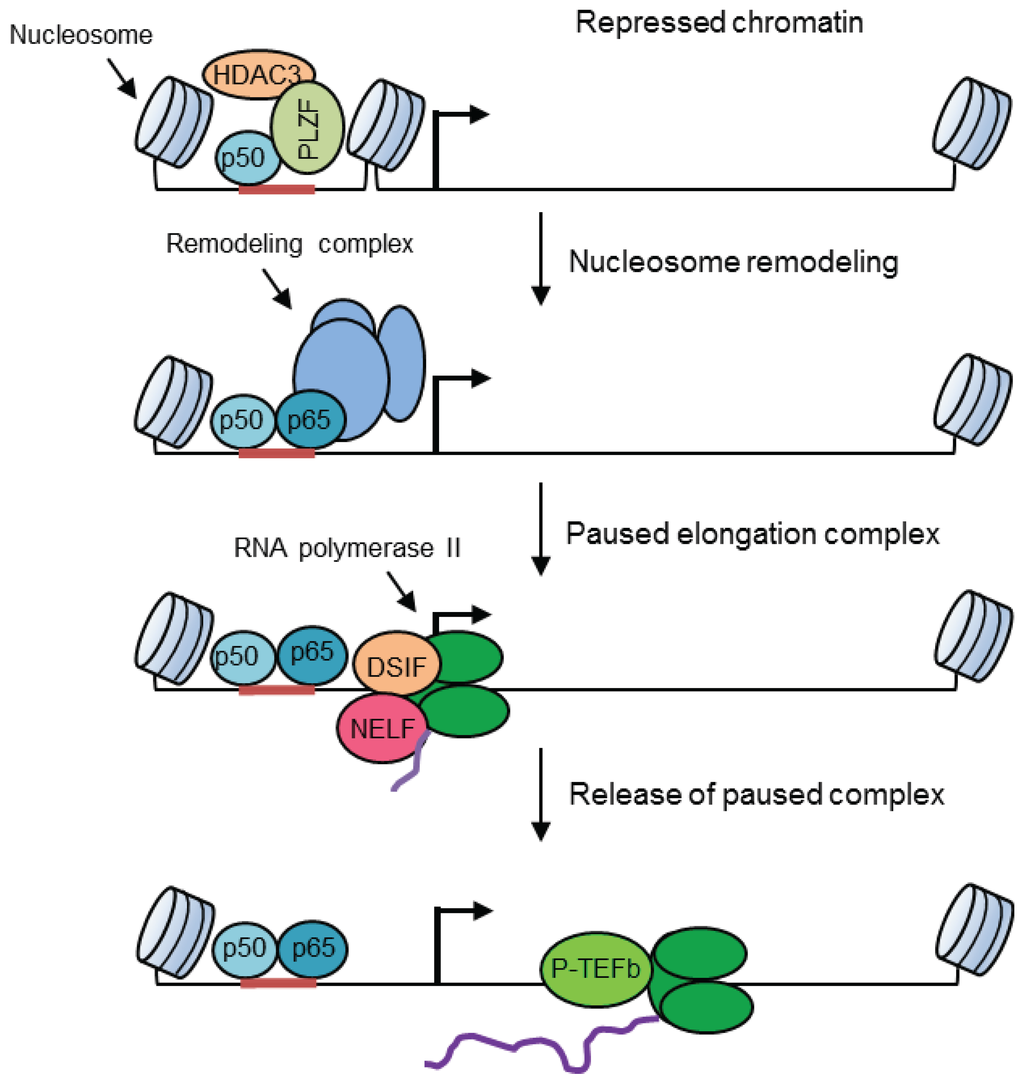 A schematic diagram showing a repressed chromatin state, nucleosome remodeling, paused elongation complex and signal-dependent pause release for the initiation of productive elongation. A transcriptionally repressed chromatin state is shown in which PLZF-mediated repressor complex comprising HDAC3 and p50 inhibits the formation of an active elongation complex. A remodeling complex induces transcription factor binding by removing nucleosomes, thus providing access of the transcription machinery to the promoter. Pausing during early elongation is facilitated by DSIF and NELF. The signal-dependent recruitment of P-TEFb results in pause release via the dissociation of DSIF and NELF from the elongation complex.
