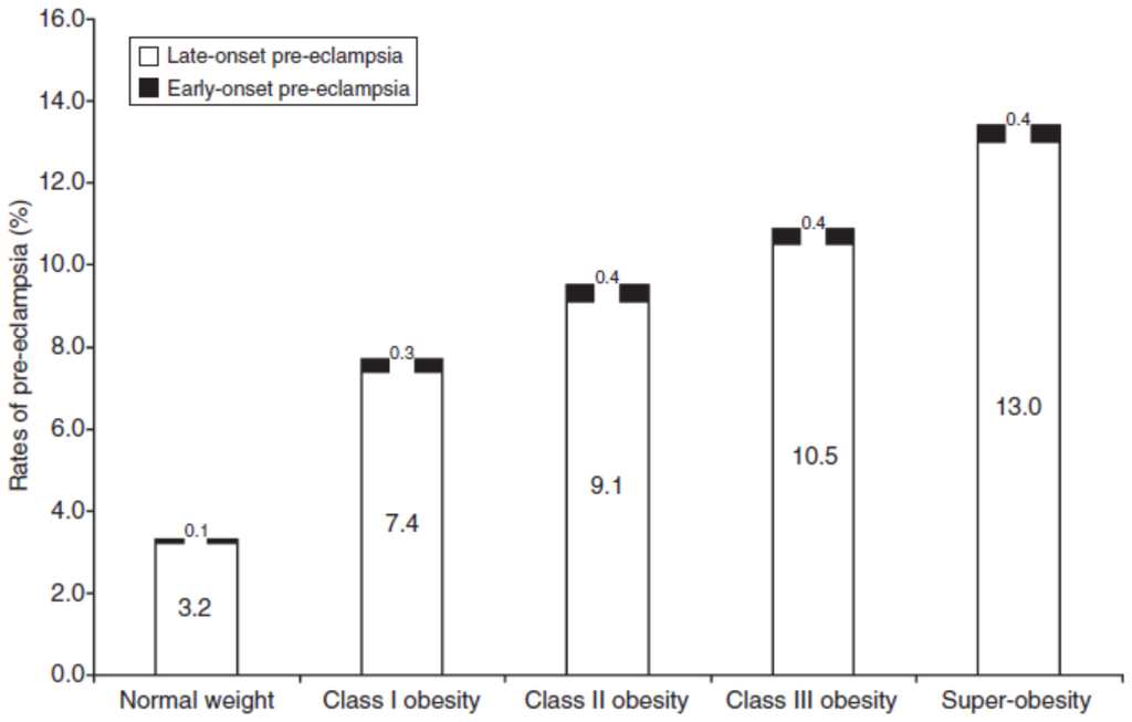 A cohort of datasets assembled by the US Centers for Disease Control and Prevention, which included 120 million women admitted to hospital for delivery from all 50 states and the District of Columbia, demonstrated that the rate of PE increased from 3.4% to 3.8% between the years 1980–2010 [26]. Although this may not seem like a dramatic increase, it was noted that whereas the occurrence of mild PE (SBP: 140–159/DBP: 90–109 mmHg) has declined by 19% from 3.1% to 2.5%, the increase in the overall prevalence was due to a 322% increase in the severe form of PE (SBP: ≥160/DBP: ≥110 mmHg). This study further concluded that obesity was a major driving factor for the increase in this maternal disorder. Other studies have also indicated that the increasing rate of PE is most likely due to the concurrent increase in obesity [27,28], which has reached pandemic proportions. Even low- and middle-income countries are experiencing increased obesity [29]. Since the early 1960s, obesity among adults aged 20 years or older has risen from 13.4 to 35.7 percent in the USA [30]. This increased prevalence of obesity during the reproductive years has lead researchers to find that there is a stepwise increase in the rates of PE with increasing body mass index (BMI) class [31] (Figure 1). However, the mechanisms linking obesity and increased risk for PE are not yet clear.