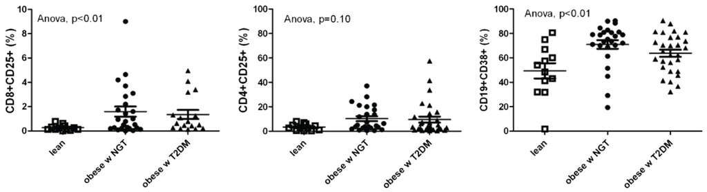 CD8+CD25+ cytotoxic T cells (as % of CD8, left), CD4+CD25+ T helper cells (as % of CD8, middle) and CD19+CD38+ B cells (as % of CD19 cells, right) in non-pregnant lean and obese women with normal glucose tolerance (NGT) or type-2 diabetes mellitus (T2DM). From: van Beek, L., et al. [35].