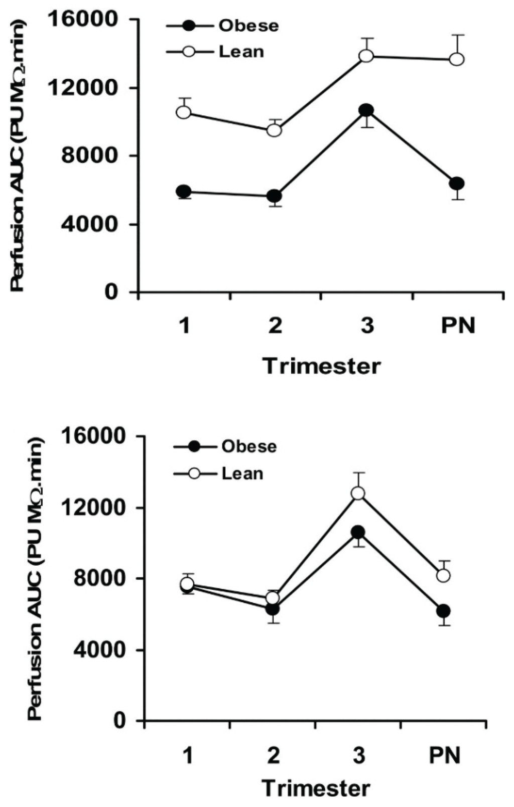 Upper panel: Endothelial-dependent vasodilation in response to iontophoresis of ACh in pregnant lean (N = 30) versus obese (N = 30) women measured at each trimester and at least 4 weeks postnatal (PN). Overall response was significantly greater in lean versus obese, p < 0.001. Lower panel: Endothelial-independent vasodilation in response to iontophoresis of SNP in pregnant lean women (N = 30) versus obese women (N = 30). Overall, there was a small but significant difference (p = 0.021) between the two groups. Mean ± SEM. From: Stewart, F.M., et al. [42].