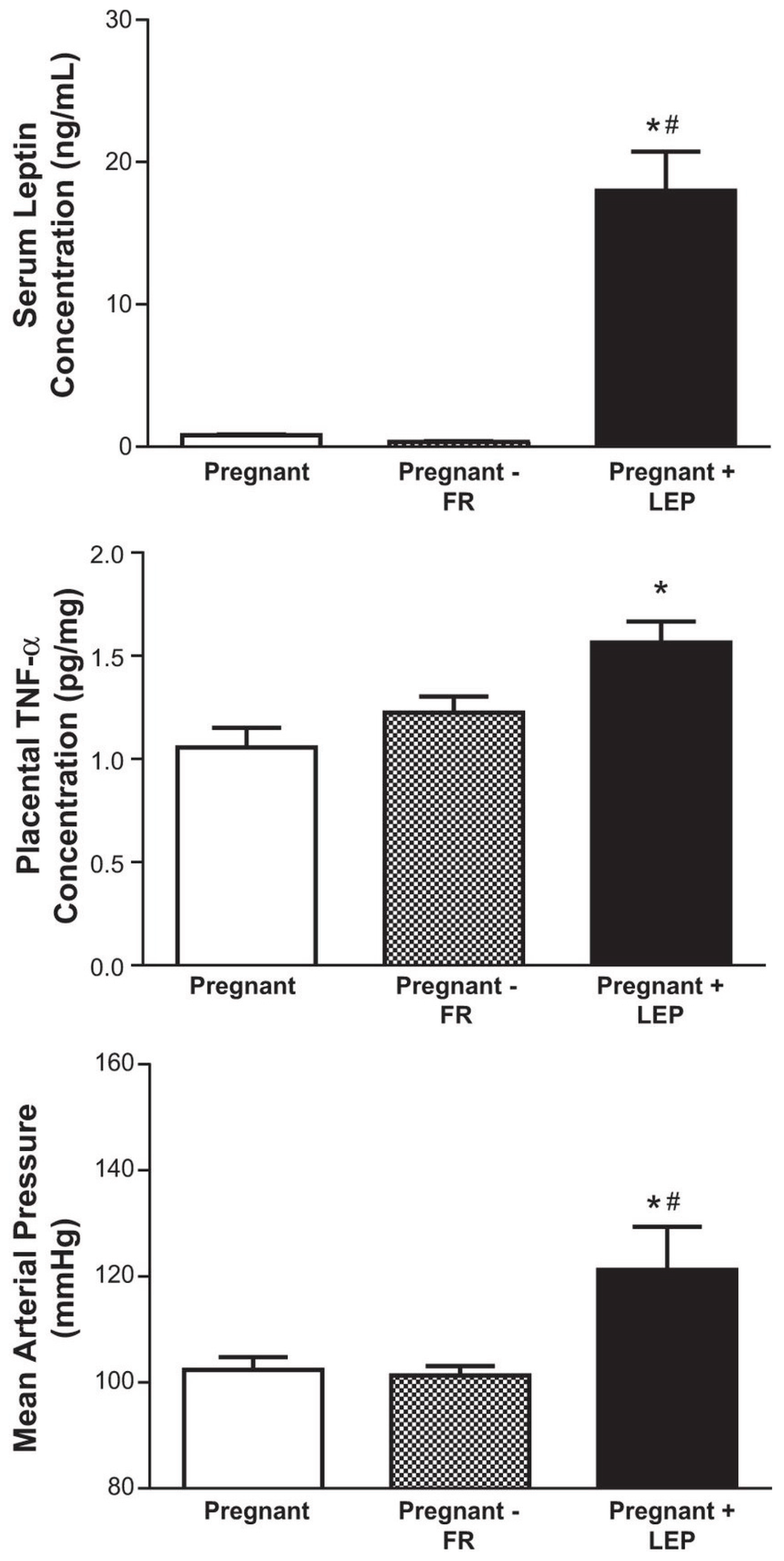 Leptin infusion (0.5 µg/kg/day) into pregnant rats (pregnant + LEP) from gestational day 14–19 elicits increases in circulating leptin (upper panel), mean arterial blood pressure (middle panel) and placental TNF-α levels (lower panel). A group of non-infused pregnant rats were food restricted (pregnant-FR) to match the reductions in food intake induced by leptin infusion. * p < 0.05 vs. pregnant; # p < 0.05 vs. pregnant-FR.