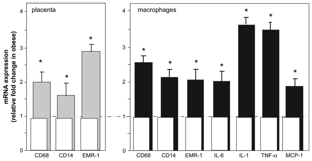 (Left) mRNA expression of macrophage markers in whole placenta villous tissue from obese (grey bars) and lean women (white bars). (Right) mRNA expression of inflammatory markers in isolated placental CD14+ macrophages in obese (black bars) and lean women (white bars). Mean ± SEM. From: Challier, J.C., et al. [114]. Expression values in lean women were set at one to assess fold change from this value in obese women. * p < 0.001 on obese compared to lean women.